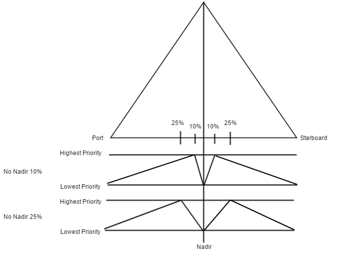 The Mosaic Style options provide control over how pixels are blended in overlapping areas near nadir. Blend is selected by default, where nadir pixels are blended with other overlapping pixels. Using either of the No Nadir options provides two methods of weighting nadir pixels to reduce their effect when you have overlapping data from other lines. If your survey lines do not overlap enough, these options will have no effect on the mosaic. No Nadir if possible 10% will prioritize +-10% of the distance from nadir to the outer beam distance. No Nadir if possible 25% will prioritize +-25% of the distance from nadir to the outer beam distance as shown in the Nadir Blending image below. In both cases, the nadir region is prioritized less.