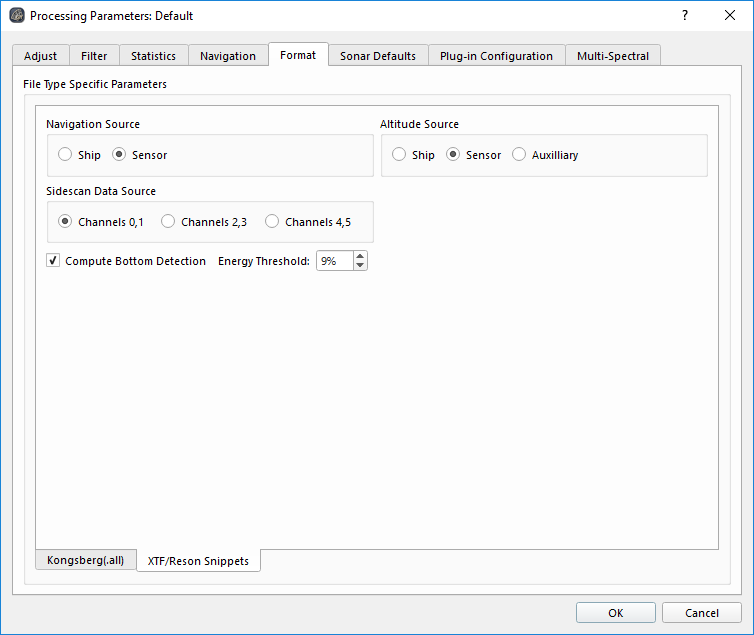 The specific options for .XTF files as shown in the Processing Dialog - .XTF Format Options figure below, primarily change the source of backscatter (sidescan) and navigation data.