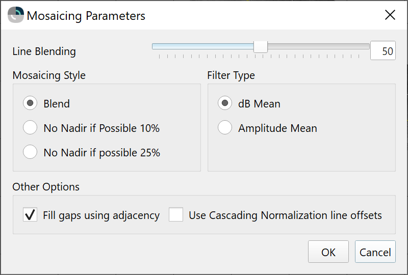 The Use Cascading Normalization line offsets option is the main control over whether or not dB offsets from the Cascading Backscatter Normalization Tool or the Line Backscatter Adjustment tool are used when mosaicing. When using either of these tools, if the user chooses to save the dB offsets, then this mosaicing option is set by default for the user.