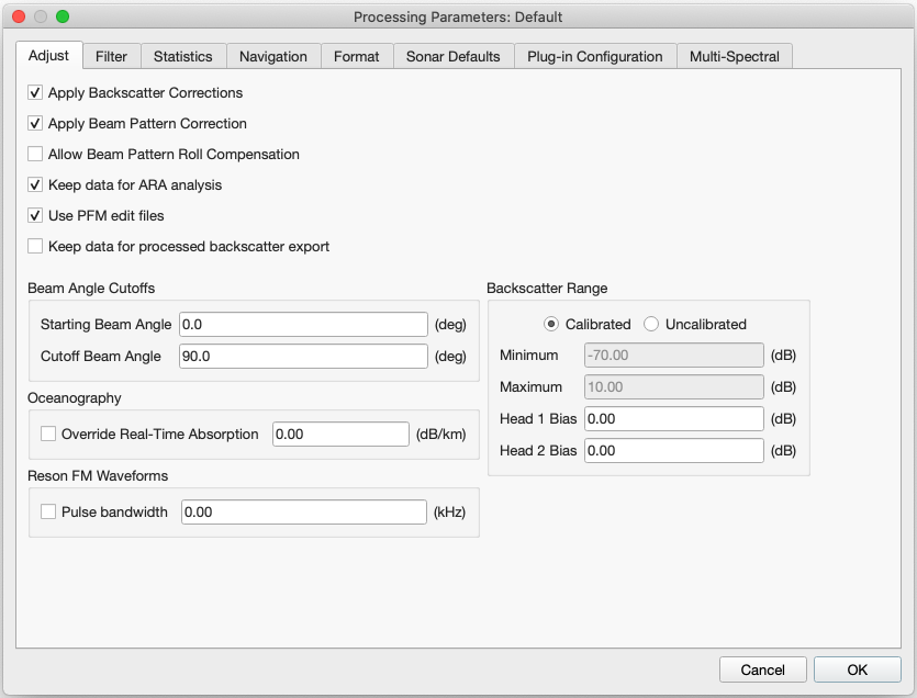 The Backscatter Range option allows for processing of sonar data that is not "calibrated". This means that after corrections are applied, the sonar data will not be in the nominal -70dB to +10dB range. If you have such sonar data, you will get a warning during filter processing. FMGT will tell you what the nominal range of your data was. You can either change the range using the minimum/maximum fields with the "Uncalibrated" option, or, you can enter a "Head Bias" value for this sonar, leaving it as "Calibrated". The head bias value will be the value necessary to get your data in the nominal -70dB to +10dB range. Non-calibrated sonars are those that return their time series data as raw amplitude without a defined means of converting that amplitude to the dB domain. FMGT has default ways to accomplish this conversion for non-calibrated sonars and one component involves a 'dB Reference' value that is exposed by the Sonar Defaults options. Any value entered in the "Head Bias" fields will be combined with values entered in the Sonar Defaults "Head 1 (or 2) dB Reference" fields when "Custom Override All" is used.