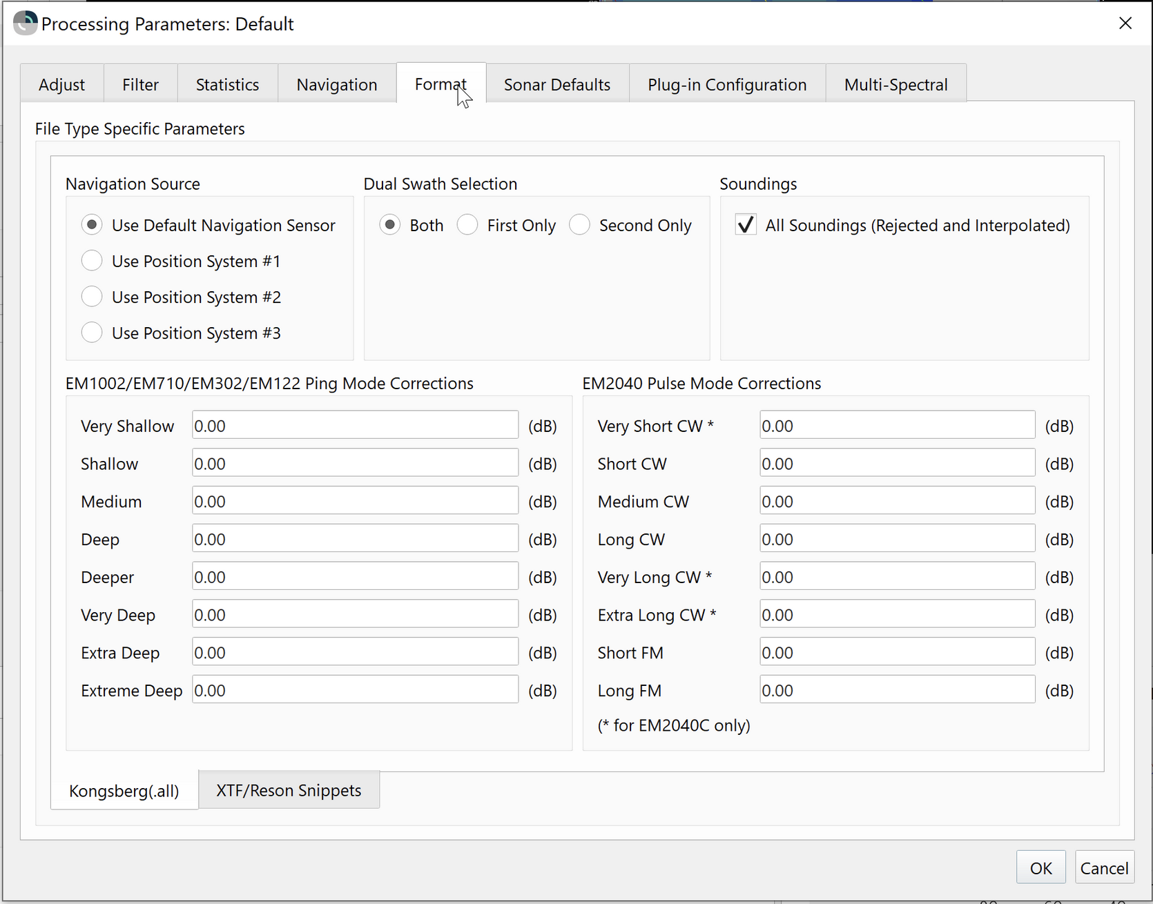 Format specific options for .ALL files as shown in the Processing Dialog - .ALL Format Options figure below provides control over the source of the navigation and compensation for dual swath sonars.