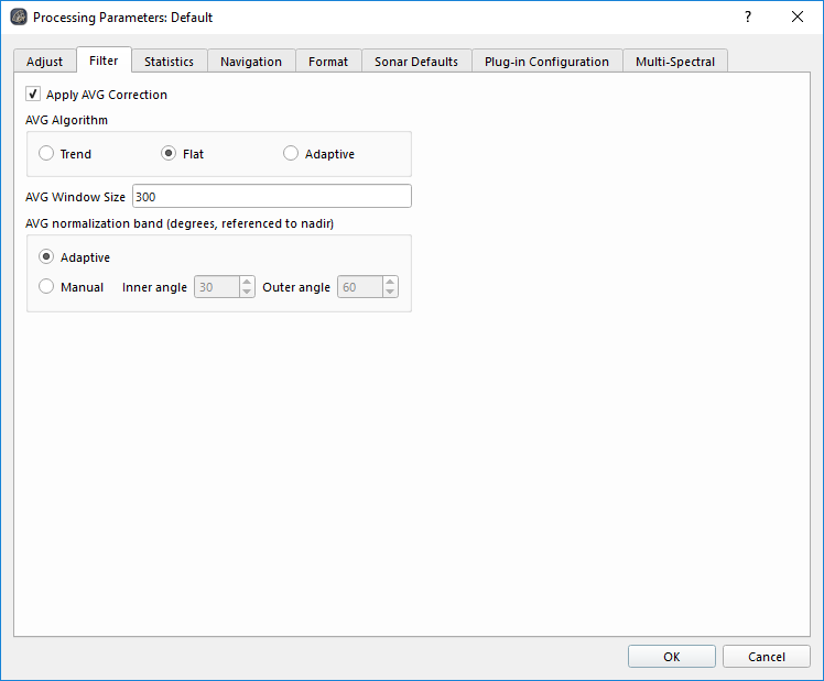 The AVG normalization band can be set to Adaptive (default setting) or Manual where you can specify the Inner and Outer angles for the AVG normalization. Adaptive uses the default angles of 30 degrees from nadir to 60 degrees from nadir and will automatically adjust the inner angle (to be 20 degrees) if the swath width becomes too narrow. Manual angles can be set according to your specific project. For example, if the swath width was limited and the line was run up or down a slope, the AVG normalization may not have enough or any beams within the 30 to 60 degree angular sector. You can then adjust the angles by bringing the inner angle in to be 10 degrees. For most projects, Adaptive mode will suffice. If you look at the mosaic and notice an abrupt change in backscatter intensity that doesn't align with changes in the sonar parameters, consider Manual mode.