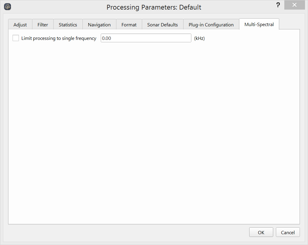 The Multi-Spectral tab allows you to restrict the data processing for pings associated with one particular frequency for sonars that allow for dynamic adjustment of the frequency during acquisition on a ping-by-ping basis. Data products such as ARA, mosaics and statistics will then only represent results from data from the chosen frequency.