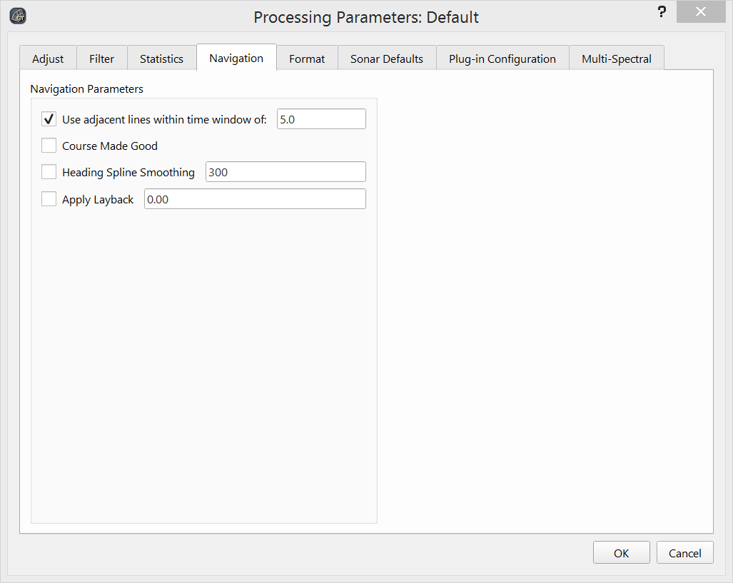 Navigation options provide control over files with poor navigation. These options are typically used for towed sidescan data. The default is to use standard linear interpretation of the current navigation data.