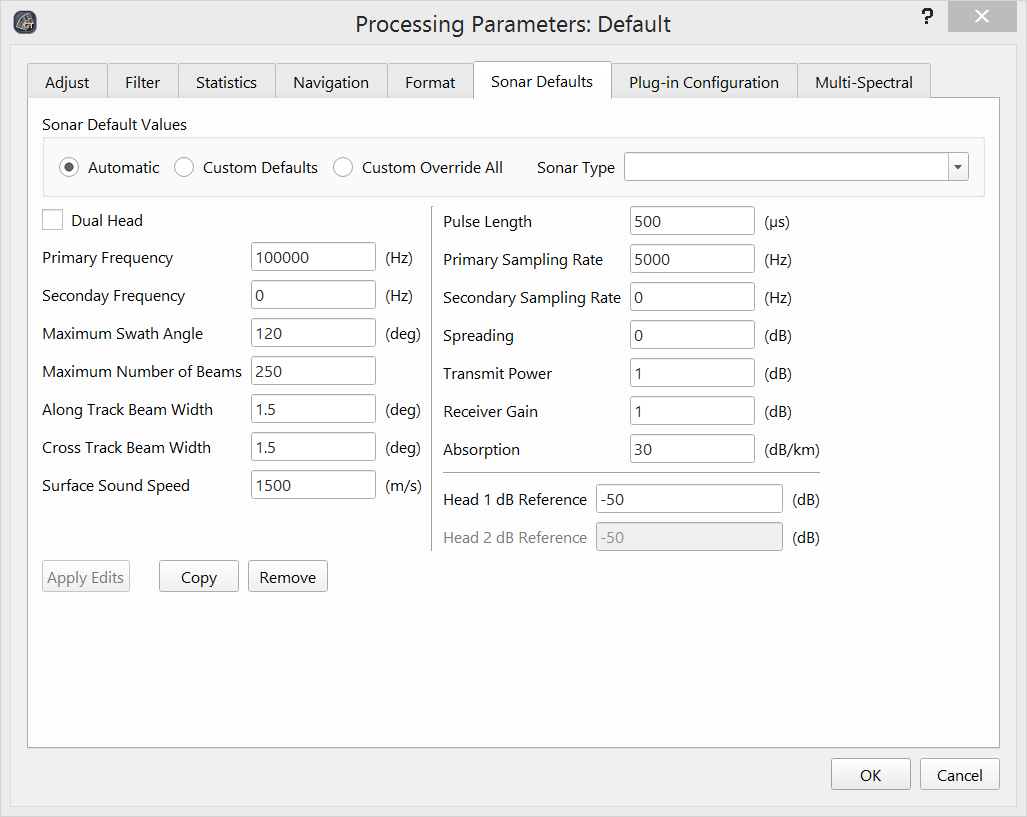 The Automatic option means FMGT will automatically select the appropriate default values according to the sonar type information found in the file. These values will then be overridden by data values extracted from the file when they exist. For example, the default pulse length value will be 500 microseconds, but if the file has a non-zero value, such as 50 microseconds, the file value will be used. The dB reference values are always used within the backscatter processing pipeline.