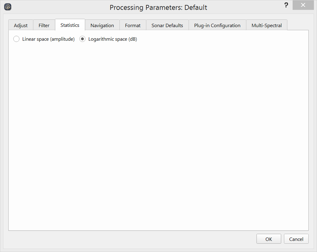 Statistics can be computed in linear of logarithmic space. By default, logarithmic space is used. These options can be seen in the Processing Dialog - Statistics Options figure below.