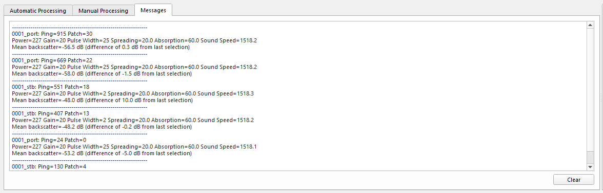 The value that is needed for the bias is the mean backscatter value and the difference from the last selection. This option is more accurate when more selections are used. For example the pings selected in the above image shows that the mean difference is 7.5 dB, or 7.8 dB as a difference of the means. Meanwhile with more subsequent selections and comparisons, the mean difference is 9.77 dB and the difference of the means is 10.07 dB. These values are much closer to the value obtained using the option one method shown above, and are therefore more likely to be closer to the real bias value.