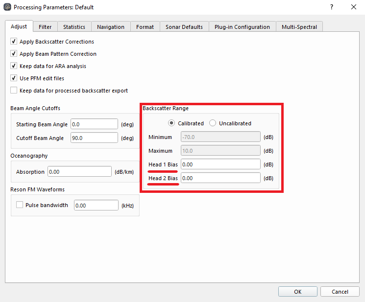 Next, create a new settings profile (Settings>Add Processing Settings), and name it appropriately. In the adjust tab of the settings editor (Settings>Processing Parameters> Edit New Settings Profile), under the backscatter range header, you can input the difference found in step 2 in one of the head bias prompts.