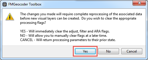 Click OK to close the Processing Parameters dialog. FMGT will indicate that the changes require reprocessing and will ask if you want processing flags to be cleared. Click Yes.