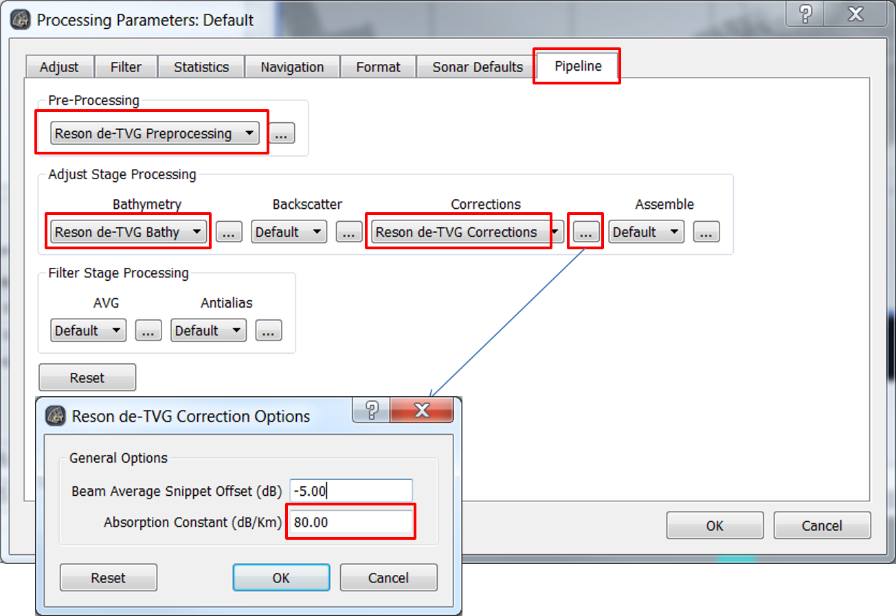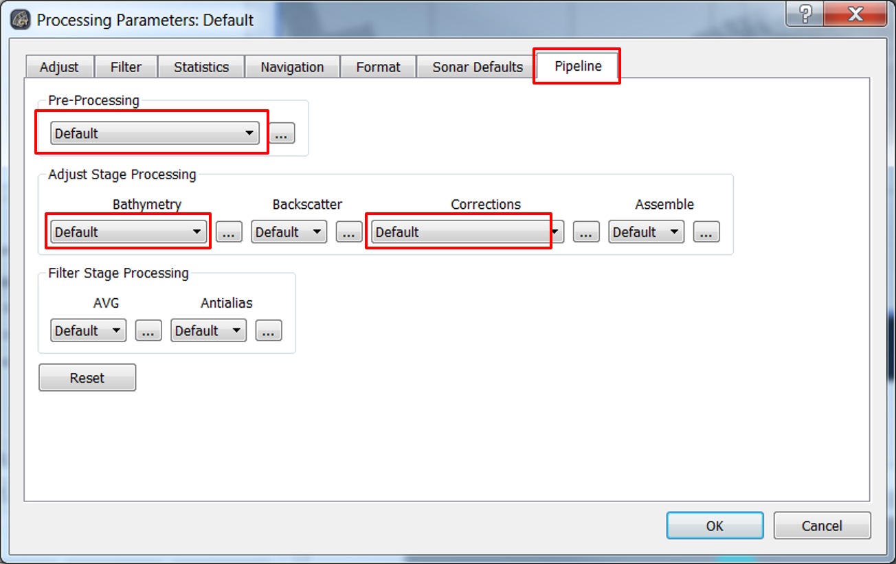 For newly created projects, no other steps need to be taken prior to processing. For older projects where the Reson de-TVG plugins were selected, go to the Pipleline tab and set all options to Default (or click the Reset button).