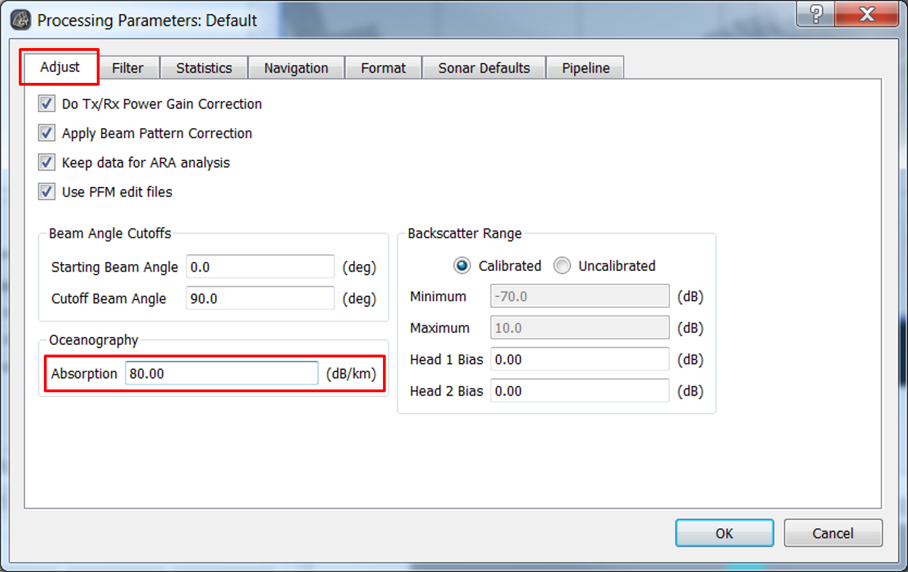 With Fledemaus version 7.4.1, the deTVG plugin algorithms are internalized and the absorption coefficient is now configured in the Oceanography section of the Adjust tab in the Processing Parameters dialog.