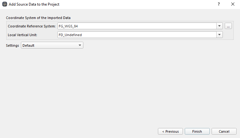 Next FMGT will ask for the coordinate system of the imported data. Once that is set, select finish.