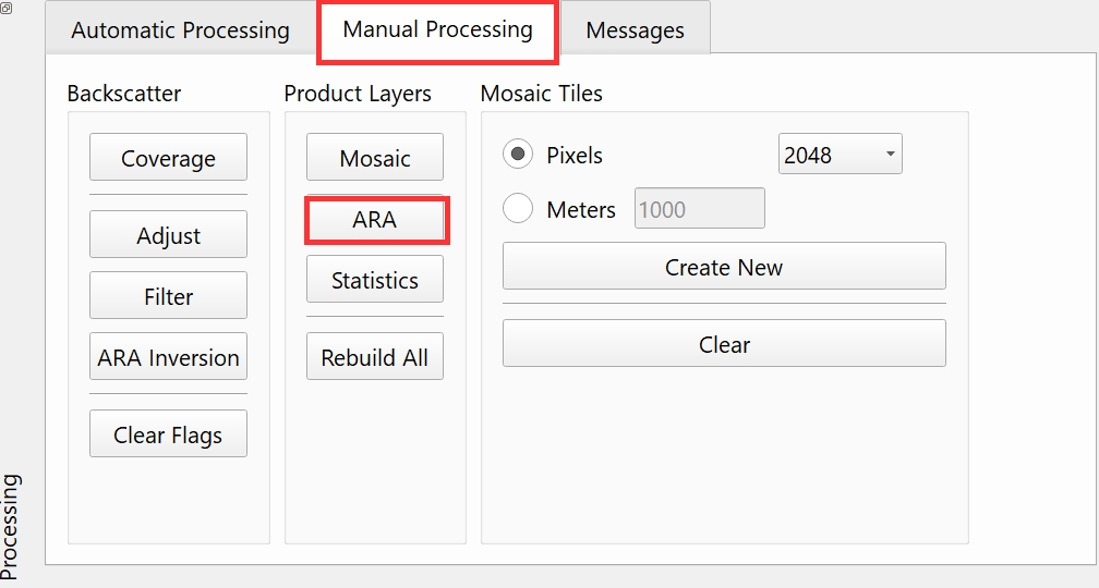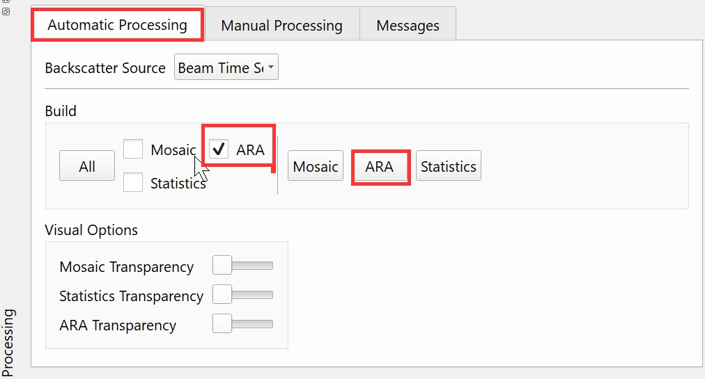 Using the ARA window involves similar steps as the beam pattern correction tool, with options to manually set parameters, as well as automatically compute parameters.