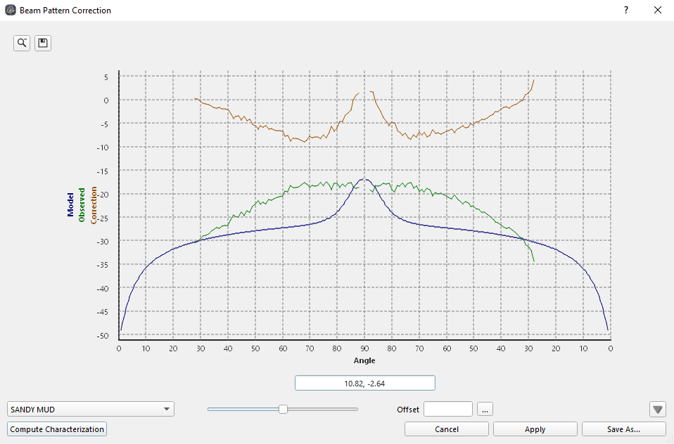 The Beam Pattern Correction menu option opens the dialog shown in the Beam Pattern Correction Dialog figure. It displays the beam pattern of the current virtual "patch" of data, the current theoretical model beam pattern and the beam pattern correction plot which is the difference between the actual and theoretical curves. This how-to page explains what a beam pattern file is, and goes step-by-step through how to first create, and then apply a beam pattern file.