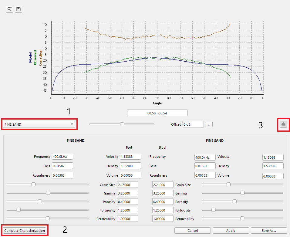 Once the dialog is up, you can either manually select a bottom type (1) or use the FMGT ARA algorithms to compute the proper classification (2). Additional parameters can be manually set by navigating to the down arrow in the bottom right corner (3).