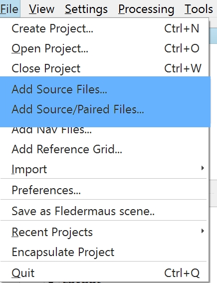To add source data, from the File menu click either Add Source Files... or Add Source/Paired Files...