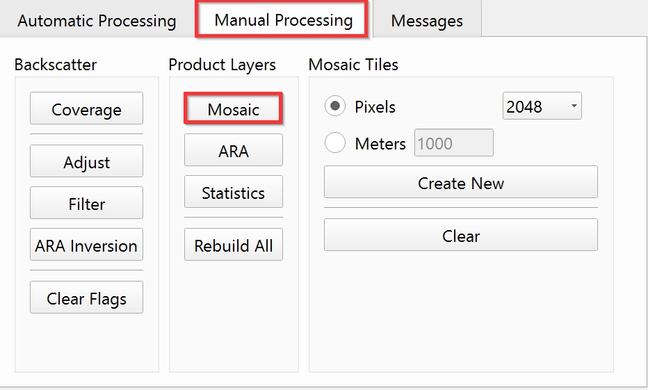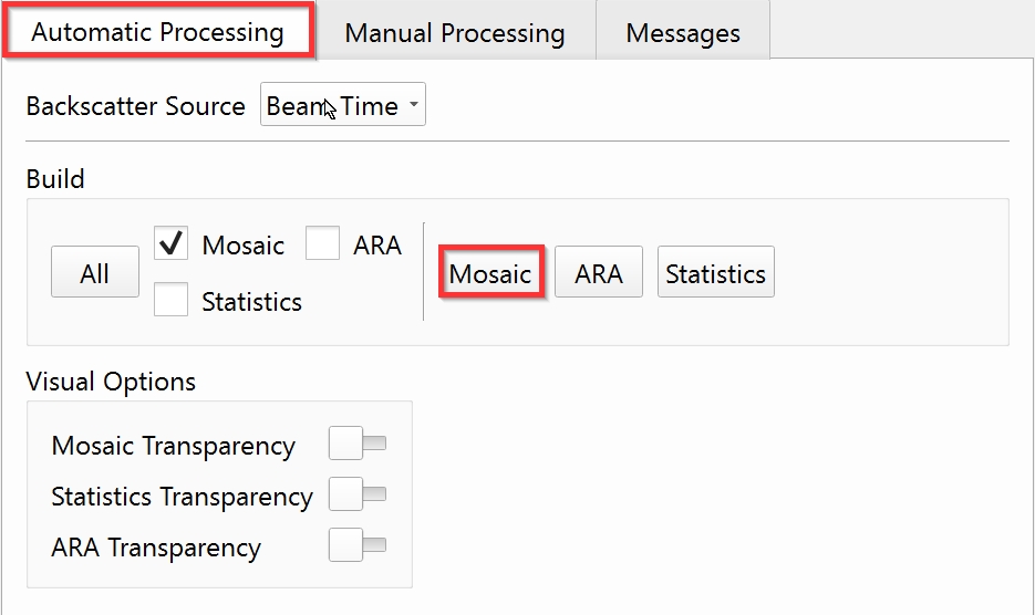 B) To make the mosaic you can either go to the Automatic Processing tab and click Mosaic or go to the Manual Processing tab and click Mosaic.