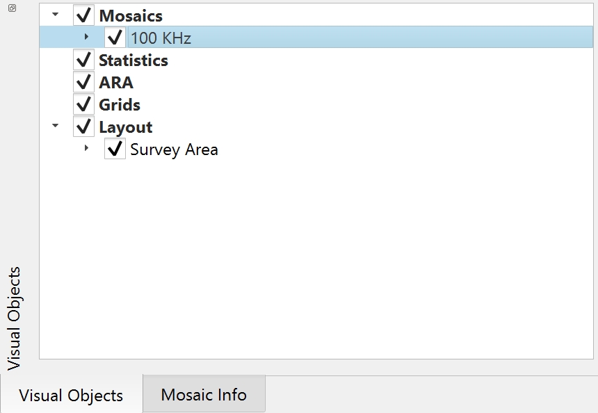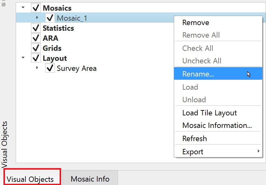 C) In the Visual Objects tab you will now see your newly created Mosaic_1. It is recommended you change the name of Mosaic_1 to a logical name, so you can differentiate your mosaics representing different frequencies. To do this right click on the mosaic and Rename.