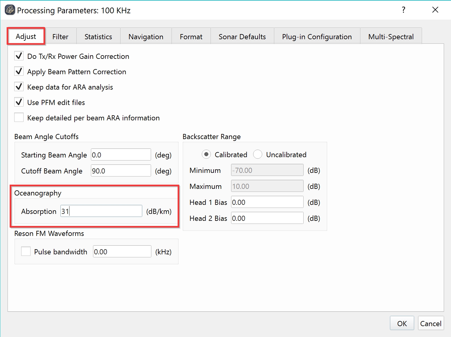 B) From the Adjust tab add the Absorption of sound in sea water for your frequency.