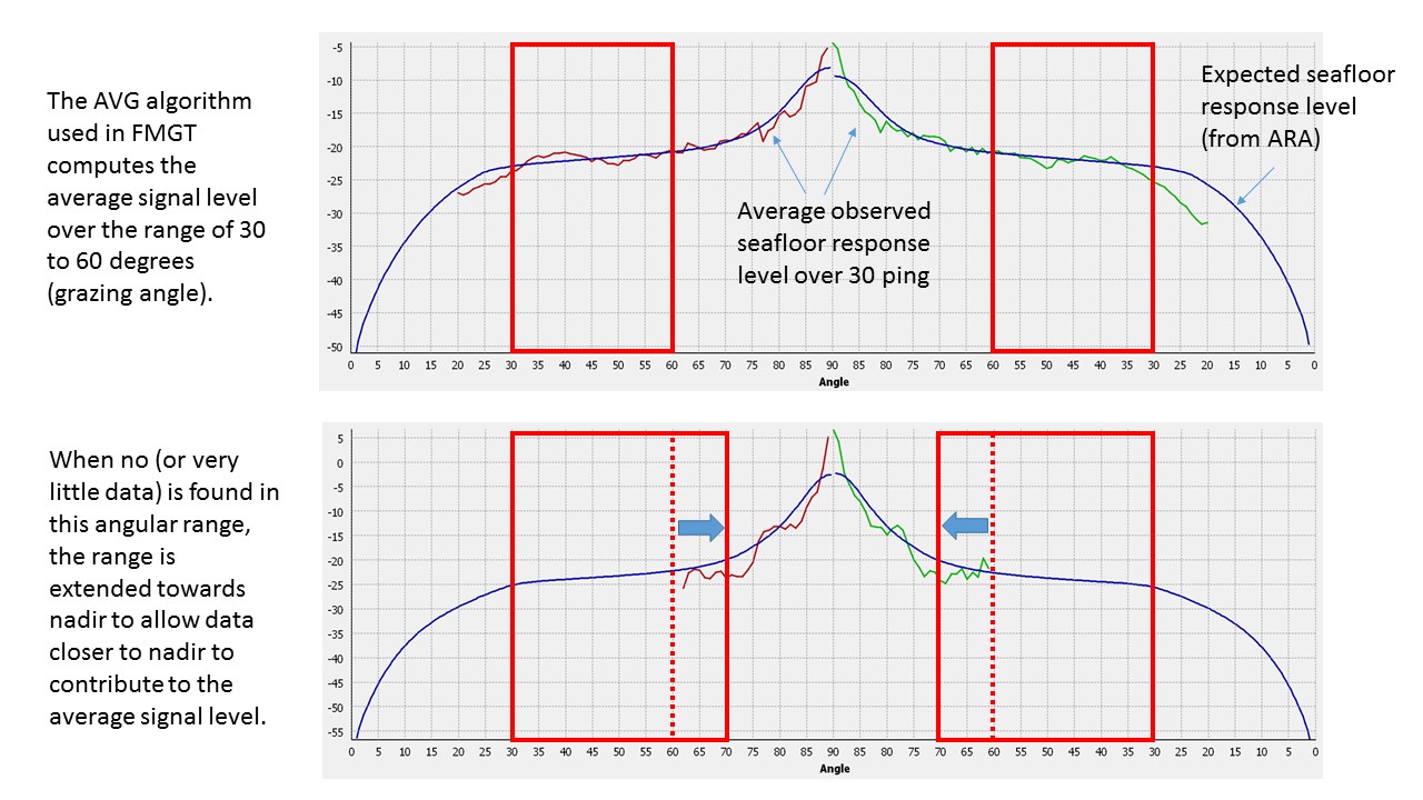 The AVG algorithm used by FMGT computes the average seafloor response level within a band of 30-60 degrees (grazing angles) to normalize the data. These are depicted by the red squares in the upper plot of Figure 1. For most MBES, this is not an issue, however for MBES that run very narrow angular swaths, the AVG algorithm would produce substandard results that would translate into a striping effect in the resulting mosaic (See left image of Figure 2).