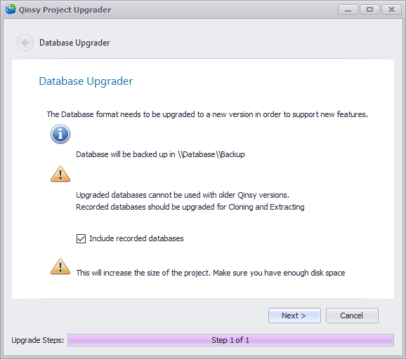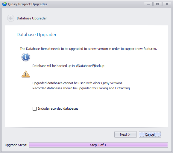 It is also possible to upgrade the recorded databases but a warning will be shown that it will not be possible to use the upgraded databases in an older Qinsy version.