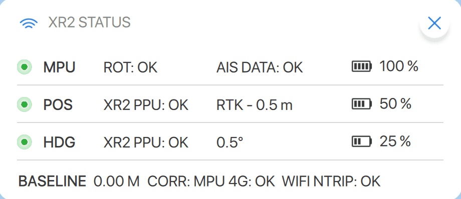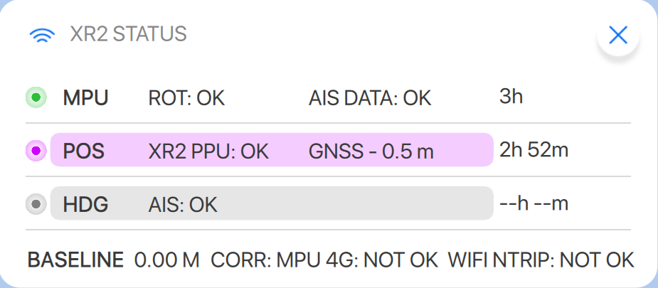 XR2 is in system mode 2 (No HDG pod). AIS HDG and NMEA HDG from MPU are available. POS pod is in GNSS mode only no differential or RTK corrections are used. RTK corrections are not available via WiFi and 4G connections.