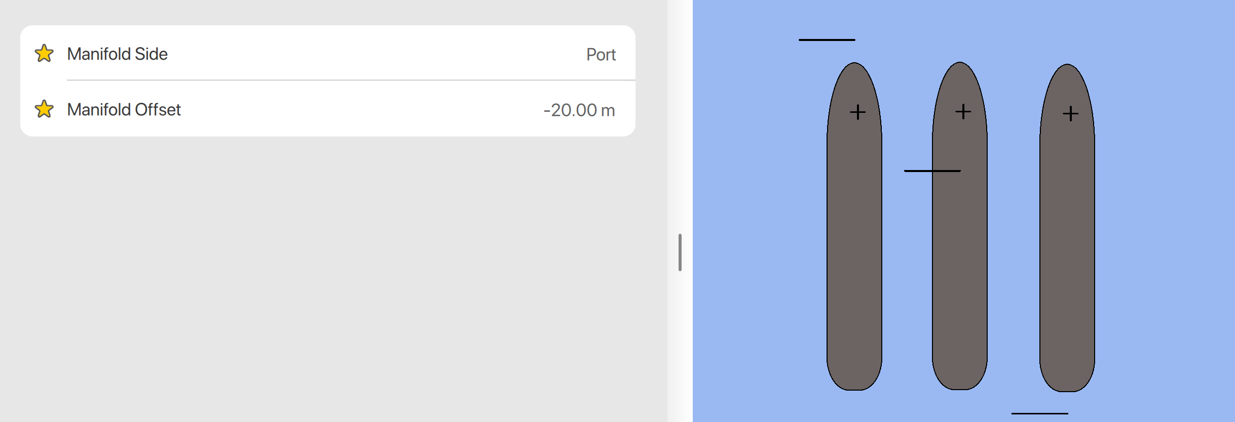 In this version of Qastor, a manifold can now be displayed with the vessel outline. The manifold position can be extended outside the vessel shape in front of the bow (Negative number) or beyond the stern (Positive number).