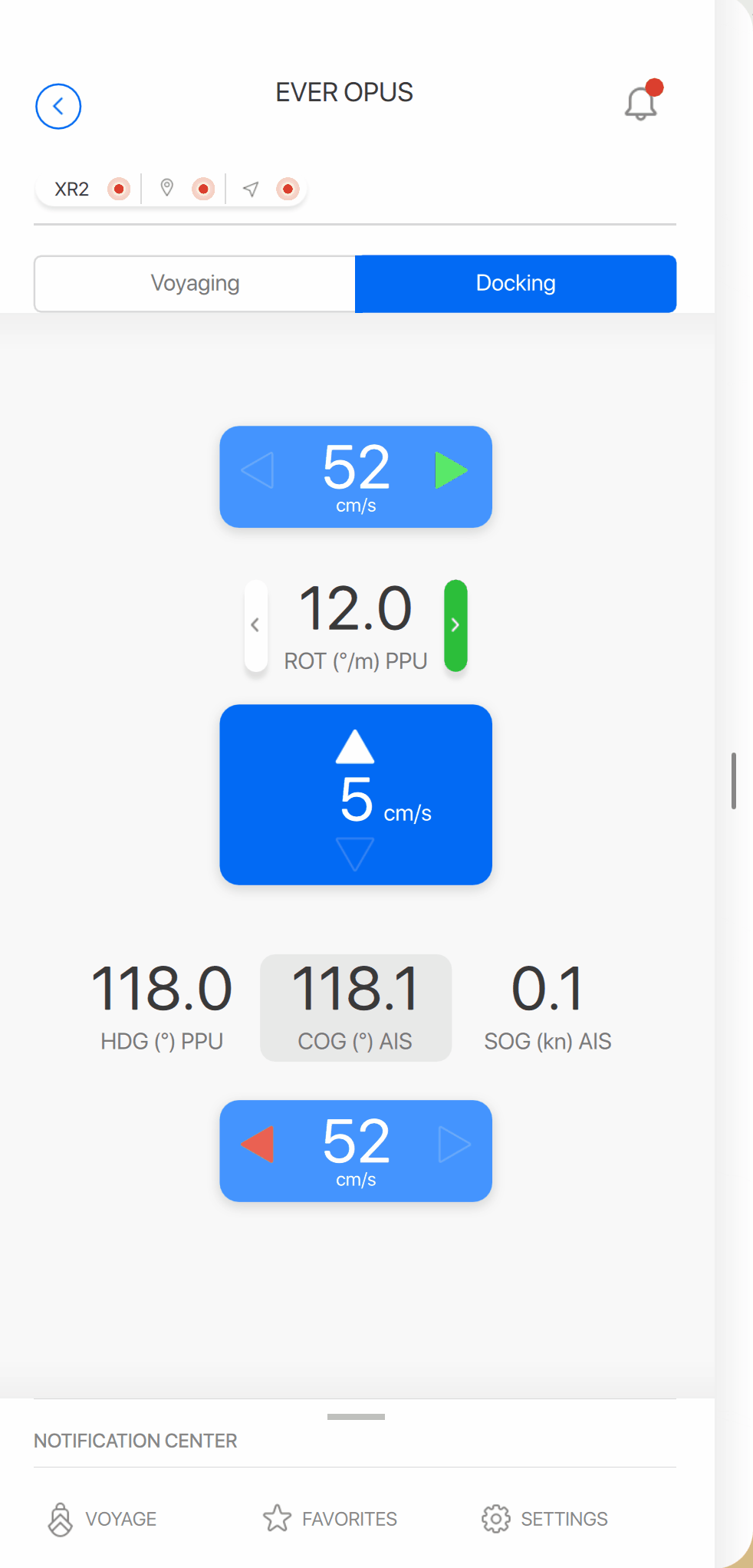 Notifications can be partially- or fully opened in the side panel. If partially opened the list can be scrolled through to not block any other parts of the side panel like Docking. When the notification panel is fully opened the 4 standard navigation parameters (HDG, ROT, COG, and SOG) are always displayed.