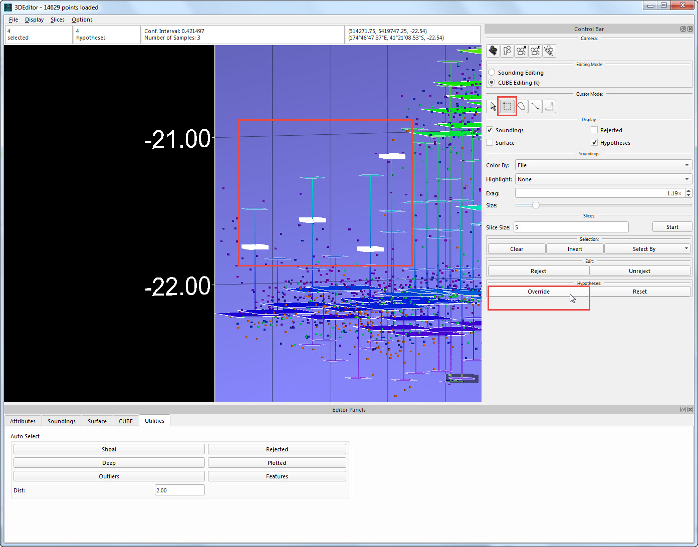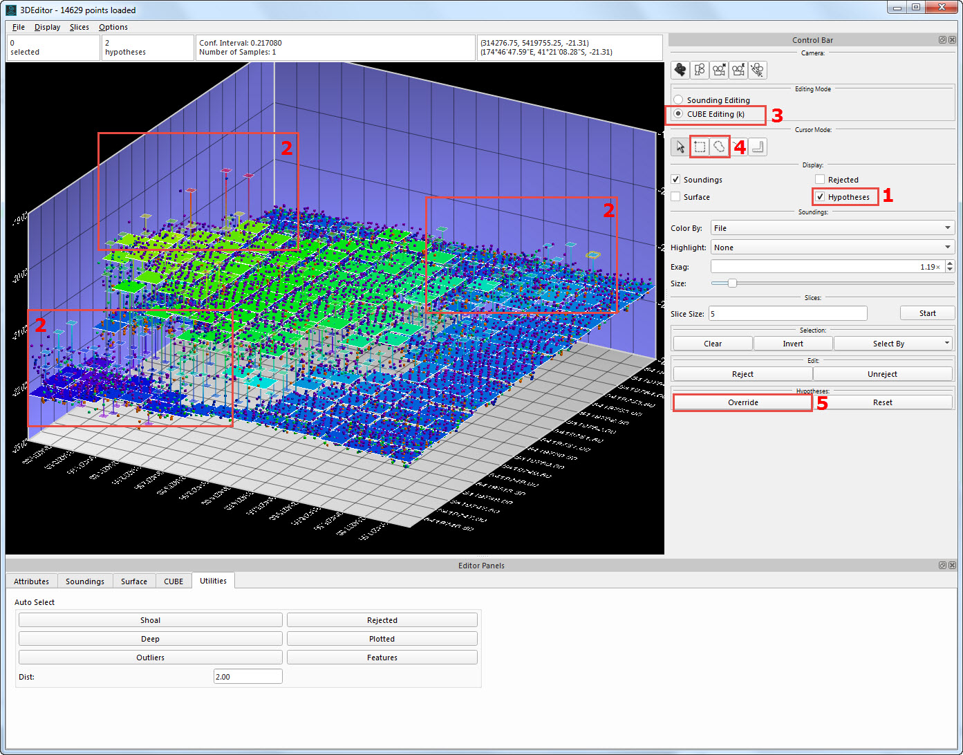 3D Editor showing CUBE hypotheses (1) as well as soundings. Areas with multiple hypotheses (2) should be reviewed. If an alternative hypothesis is more correct, use CUBE Editing Mode (3) and the Select or Area Select Mode to select the alternative hypothesis/hypotheses and click Override (5).