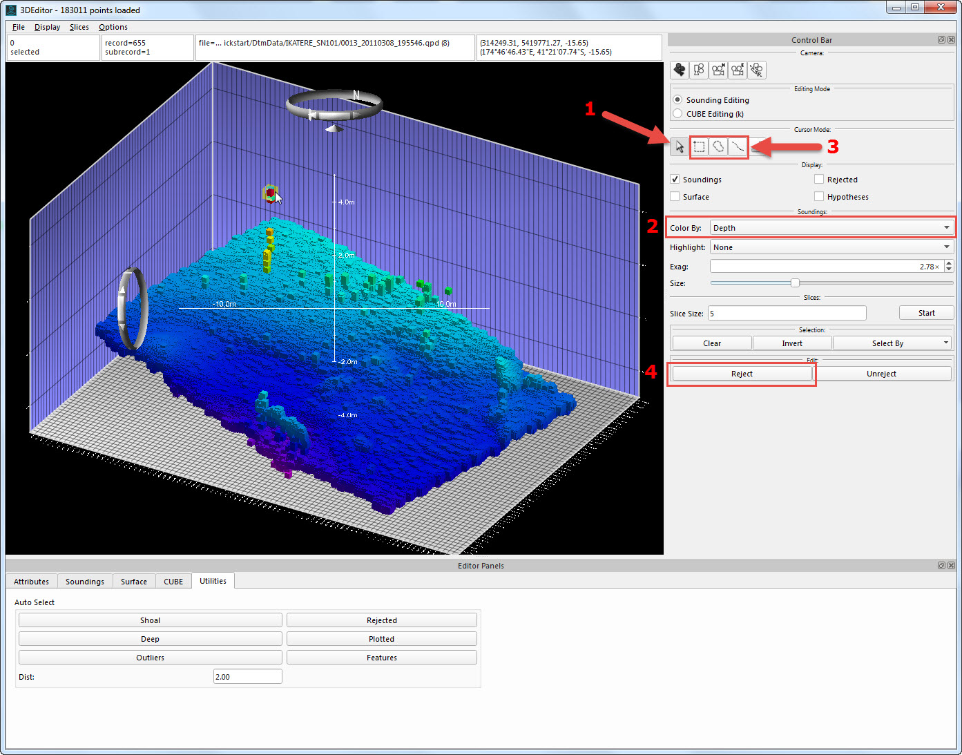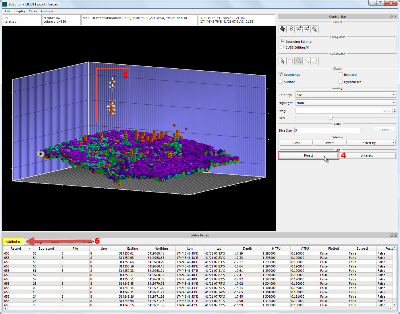 Soundings selected (5); sounding attributes can be viewed in the Attributes tab (6). Click Reject to remove the soundings (4).