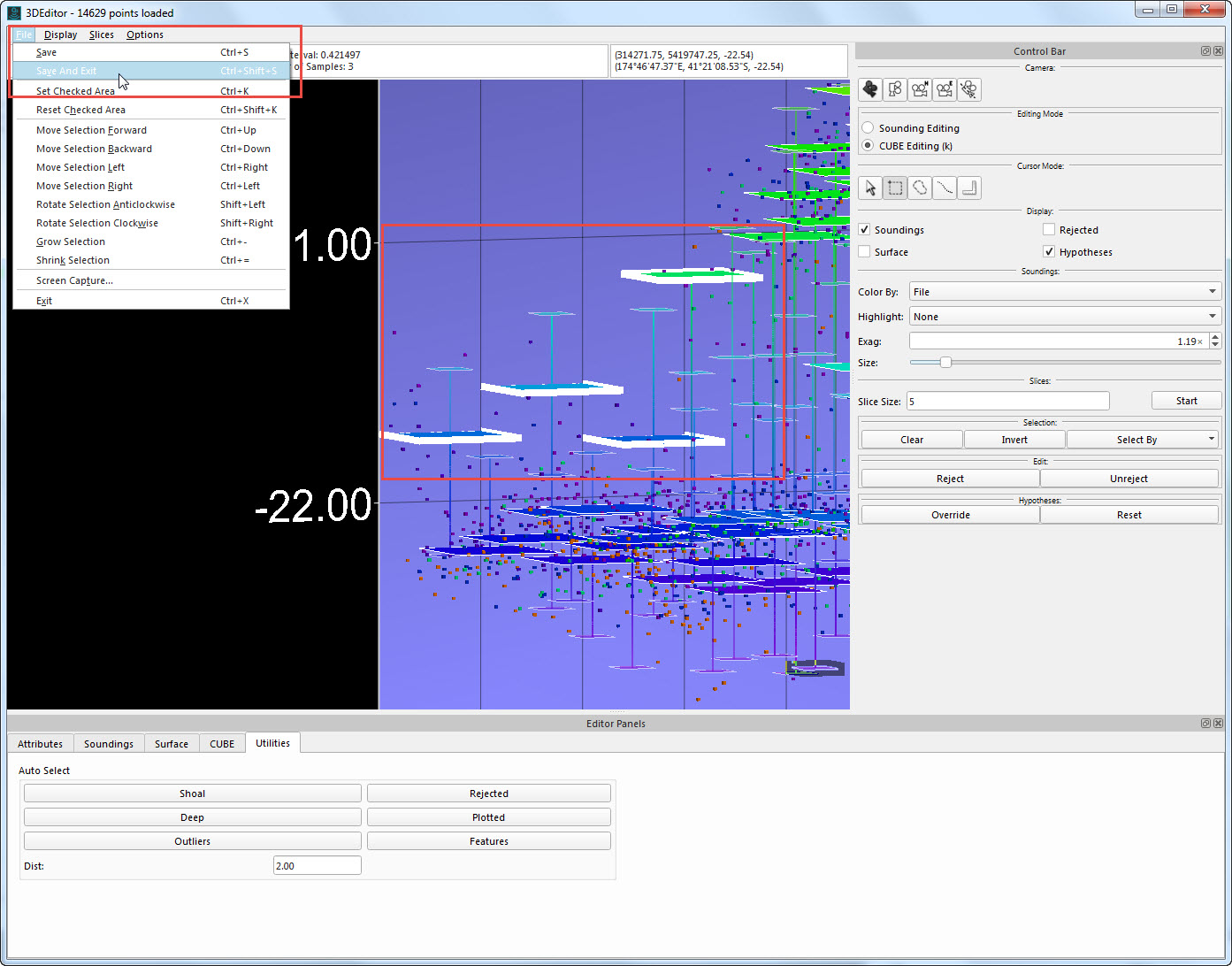CUBE Editing results in a clean CUBE grid that can be saved as a BAG (Bathymetric Attributed Grid) or used as a tool for filtering and rejecting all soundings that lie too far from this grid.