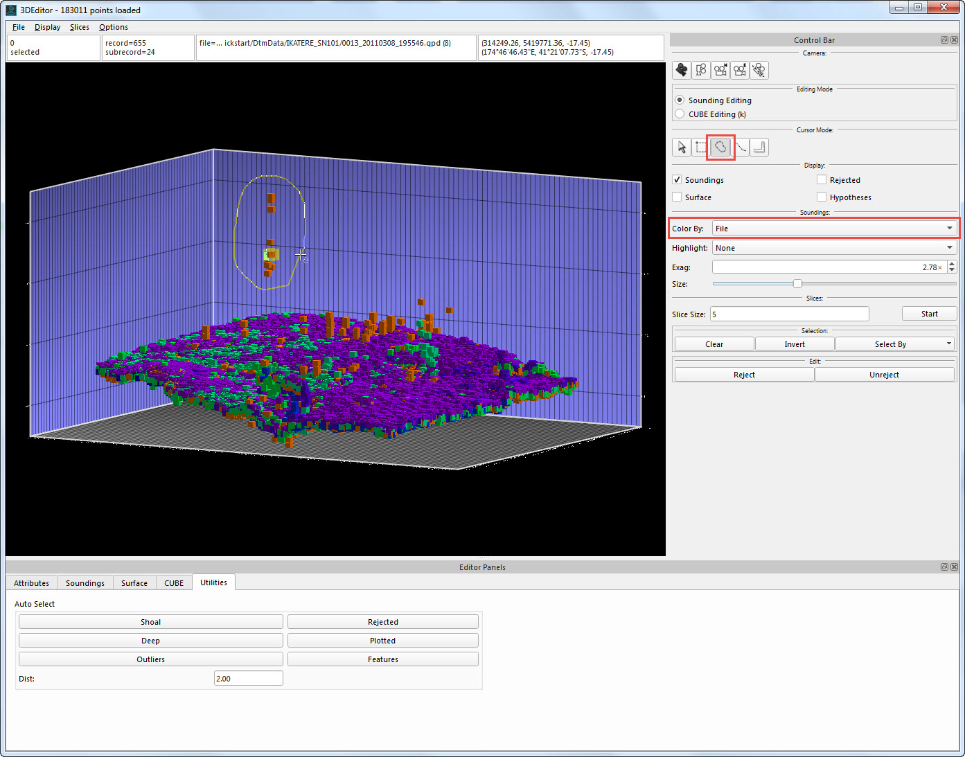 Selection coloured By File; soundings selected for Rejection.