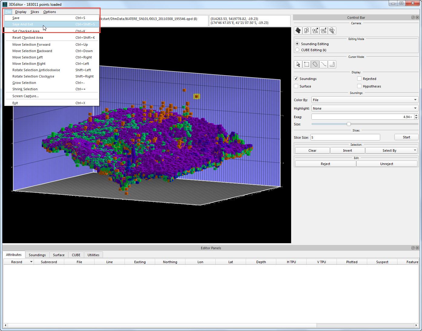 Rejected soundings are removed; Save and Exit to update grid.