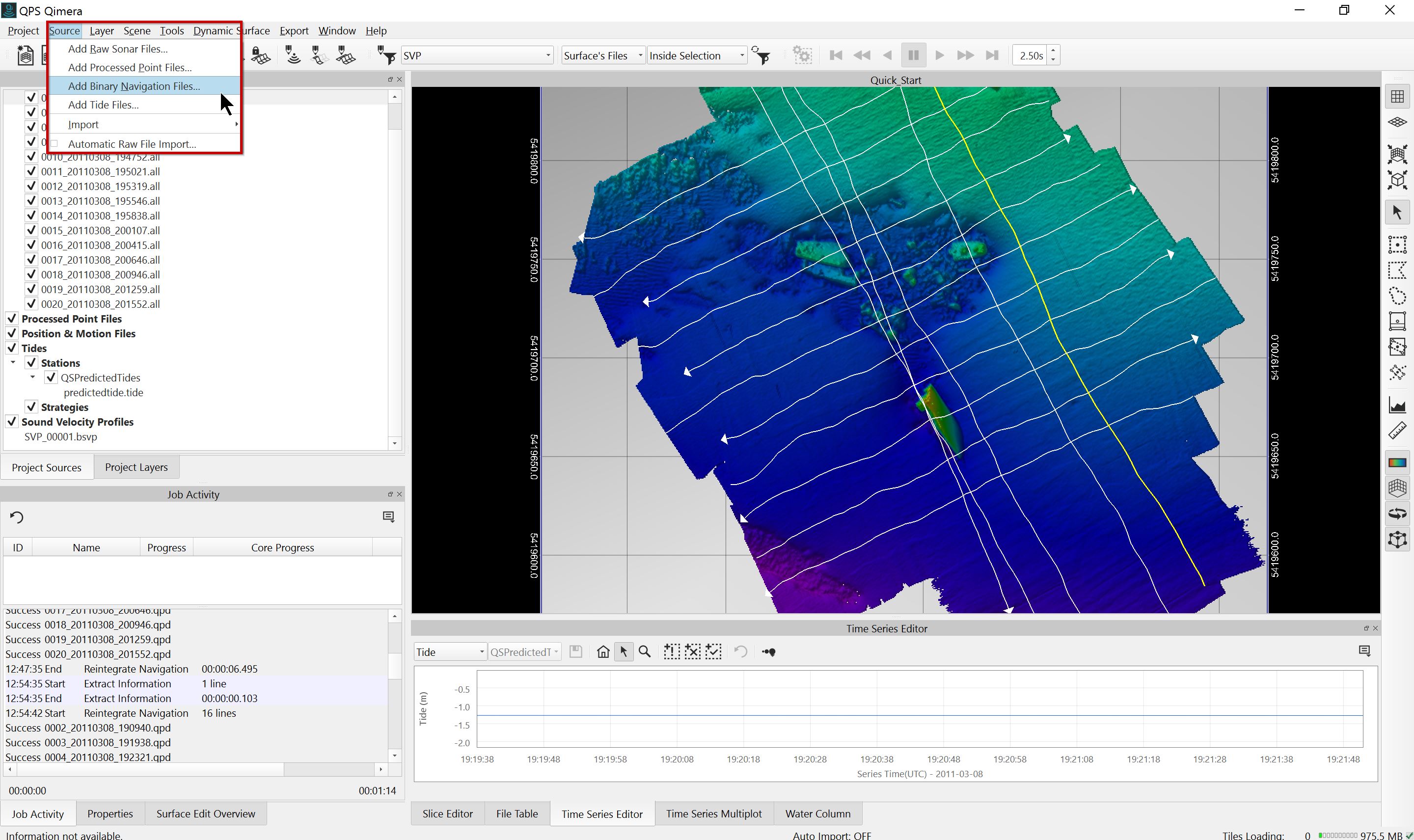 Other Binary Navigation sources (SBET or POSMV) can be added and used for vertical referencing and/or position/motion/heading. These files can be added to Qimera by going to the Source menu and selecting Add Binary Navigation Files.