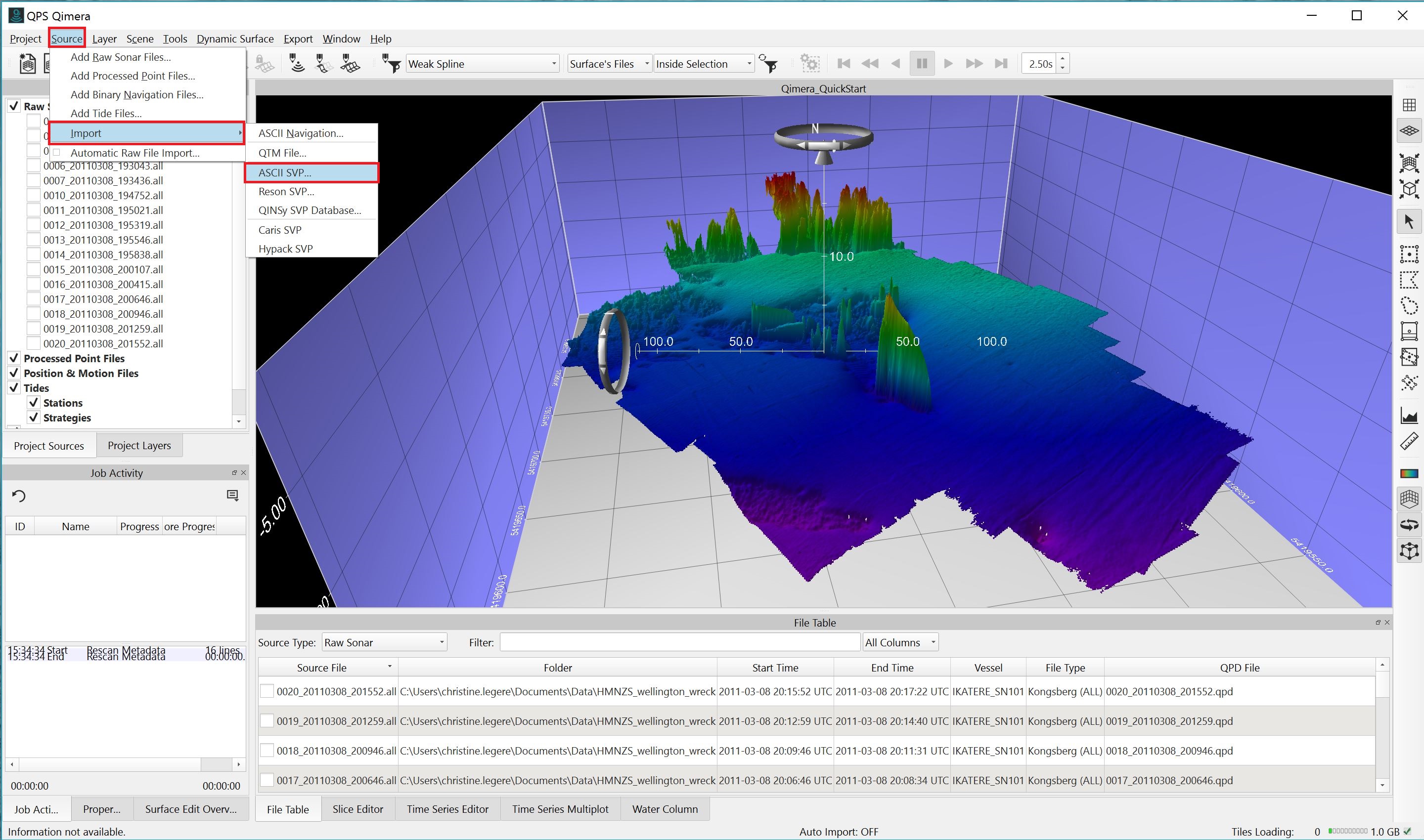 ASCII, Hypack, and Caris SVP information can be added to Qimera by going to the Source menu and selecting Import > ASCII SVP, Import > Caris SVP, or Import > Hypack SVP.