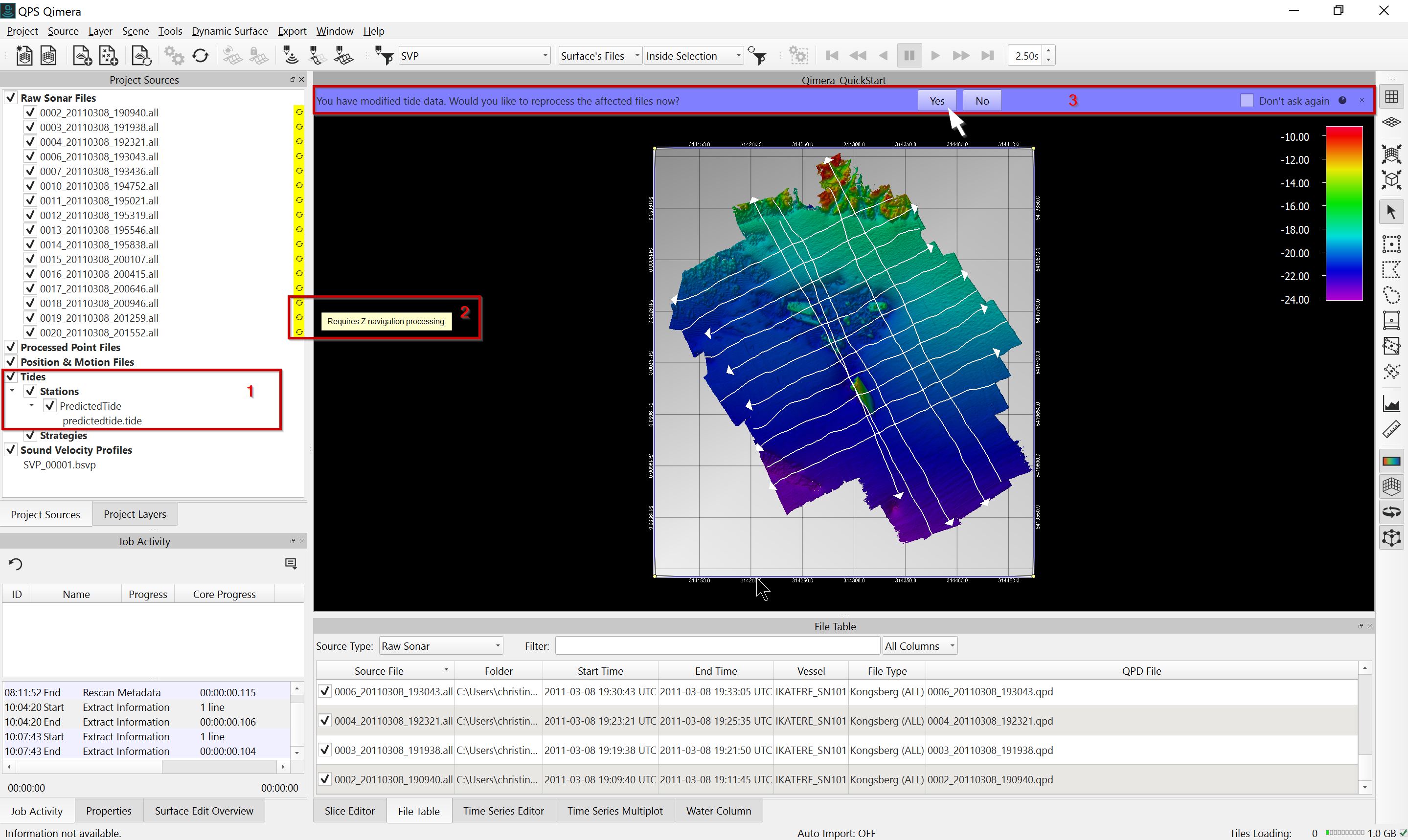 Once the tide information has been added to the project it will be listed in the Project Sources Dock under Tide Files (1). Adding Tide information will mark all affected files as needing processing (2), indicated by the