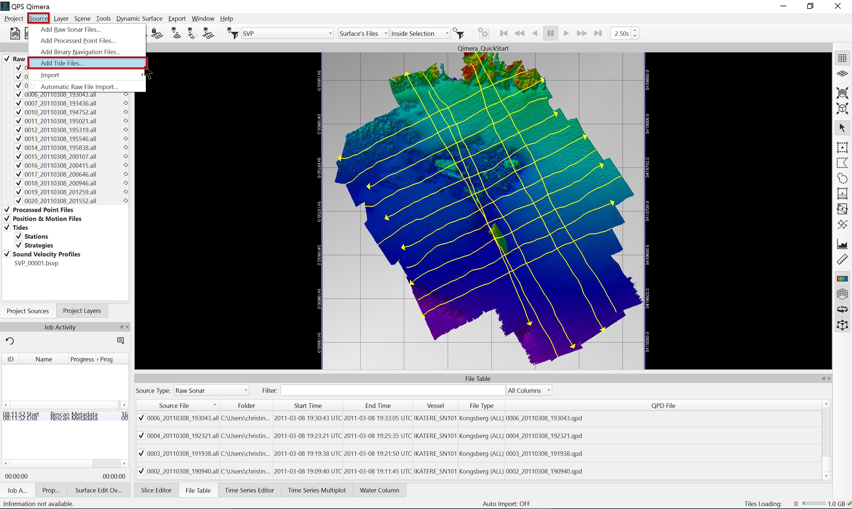 Qimera supports a variety of tide formats directly (click here for a list of all supported tide formats); alternatively, an ASCII file with tide information can also be imported and configured. Supported tide formats and ASCII Tide can be added to Qimera by going to the Source menu and select Add Tide File.
