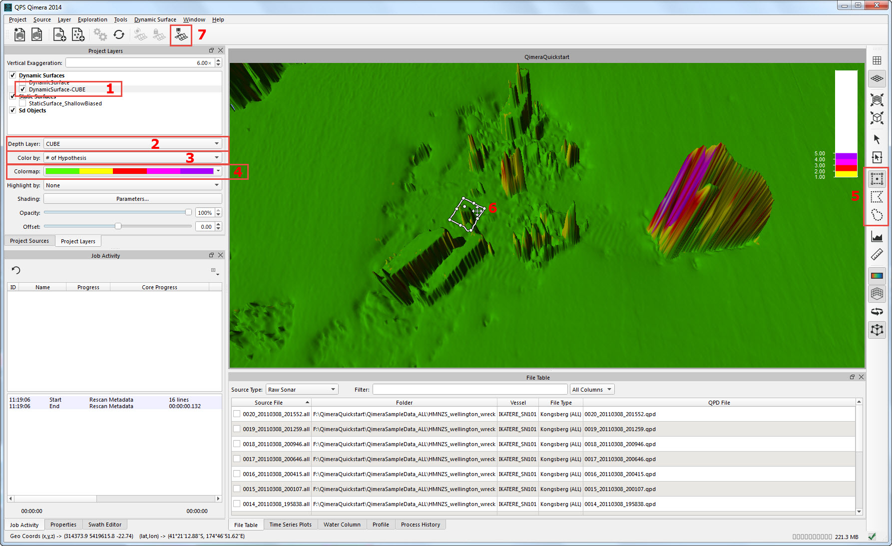 Dynamic grid with CUBE selected (1) and CUBE Depth Layer selected (2). colour By set to Number of Hypothesis (3) and colourmap edited to show areas with more then one hypothesis (4). Explore grid and use a selection mode (5) to select an area (6) with multiple hypotheses. Finally, launch the 3D Editor (7).