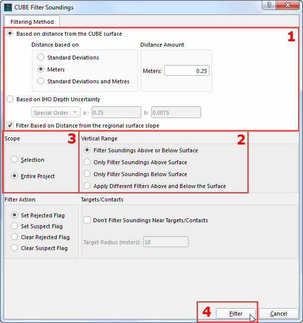 Set the Filtering Method (1), Vertical range (2), and Scope (3) and then click Filter (4).