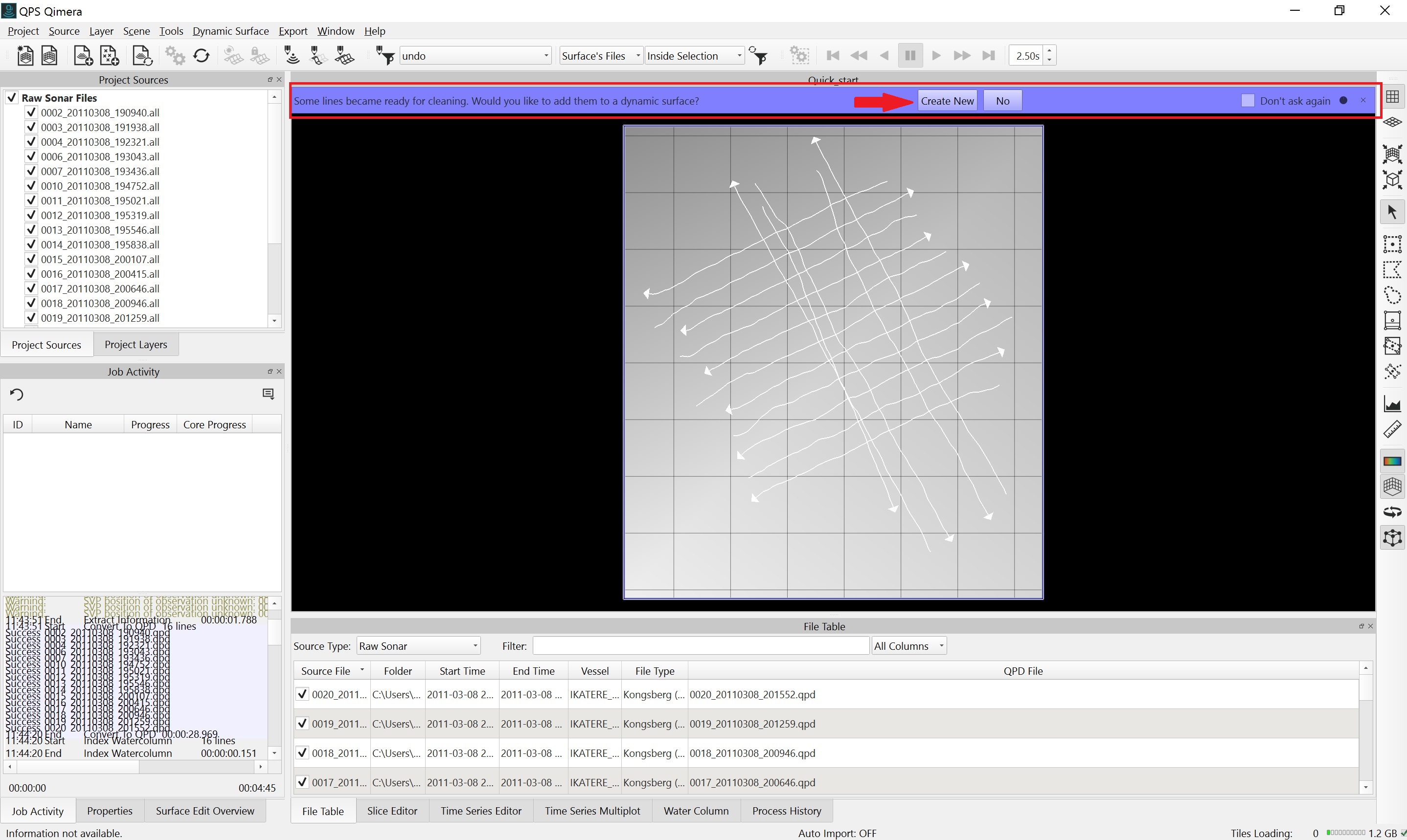 Once the files have loaded, Qimera will prompt you that lines have become ready for cleaning, and ask whether you would like to add them to a Dynamic Grid. Dynamic Grids are gridded bathymetric grid models that can be viewed and edited in 2D or 3D; they are "dynamic" because they reflect the state of the processed data (the QPD files) and will update to reflect changes you make during various processing steps. Click Create New in the Dynamic Workflow prompt in 4D Scene to start building your Dynamic Grid. Alternatively, if the Dynamic Workflow does not activate, a new Dynamic Grid can be created by selecting from the main toolbar Layer → Create Dynamic Grid.