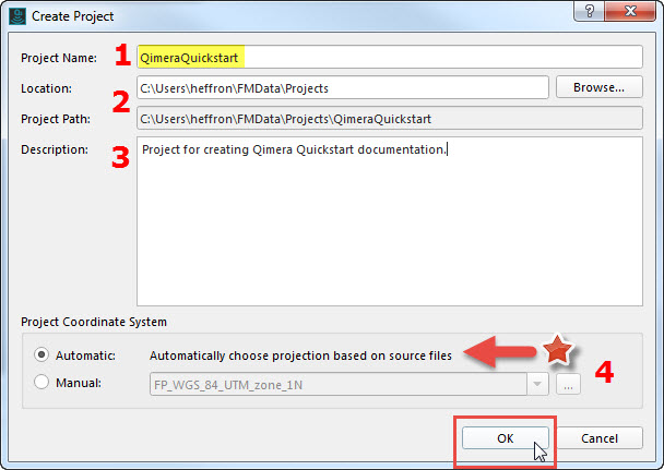 The Create Project dialogue will launch. Add project name information (1). By default, the folder for your project will be in the '/Users/username/FMData/Projects' directory (2), though you can choose any location. Once created, the project folder will contain sub-folders for storing bathymetry files in QPD format, internal metadata, extracted external source data, and products. The Description box (3) can be used to add additional notes about the project. Finally, the default ("Automatic" option) is for Qimera to automatically set the project coordinate system based on the first imported line of source data (4). For unprojected/geographic source data, the closest UTM zone will be used; for projected data, the project projection will match that of the source data as set by the user on import. If you prefer, you can select the Manual radial button and manually select a different projection.