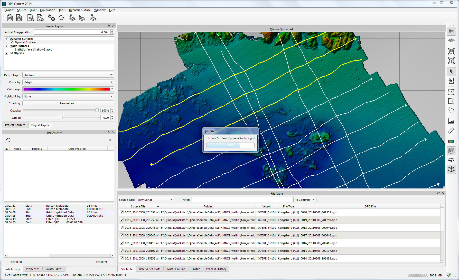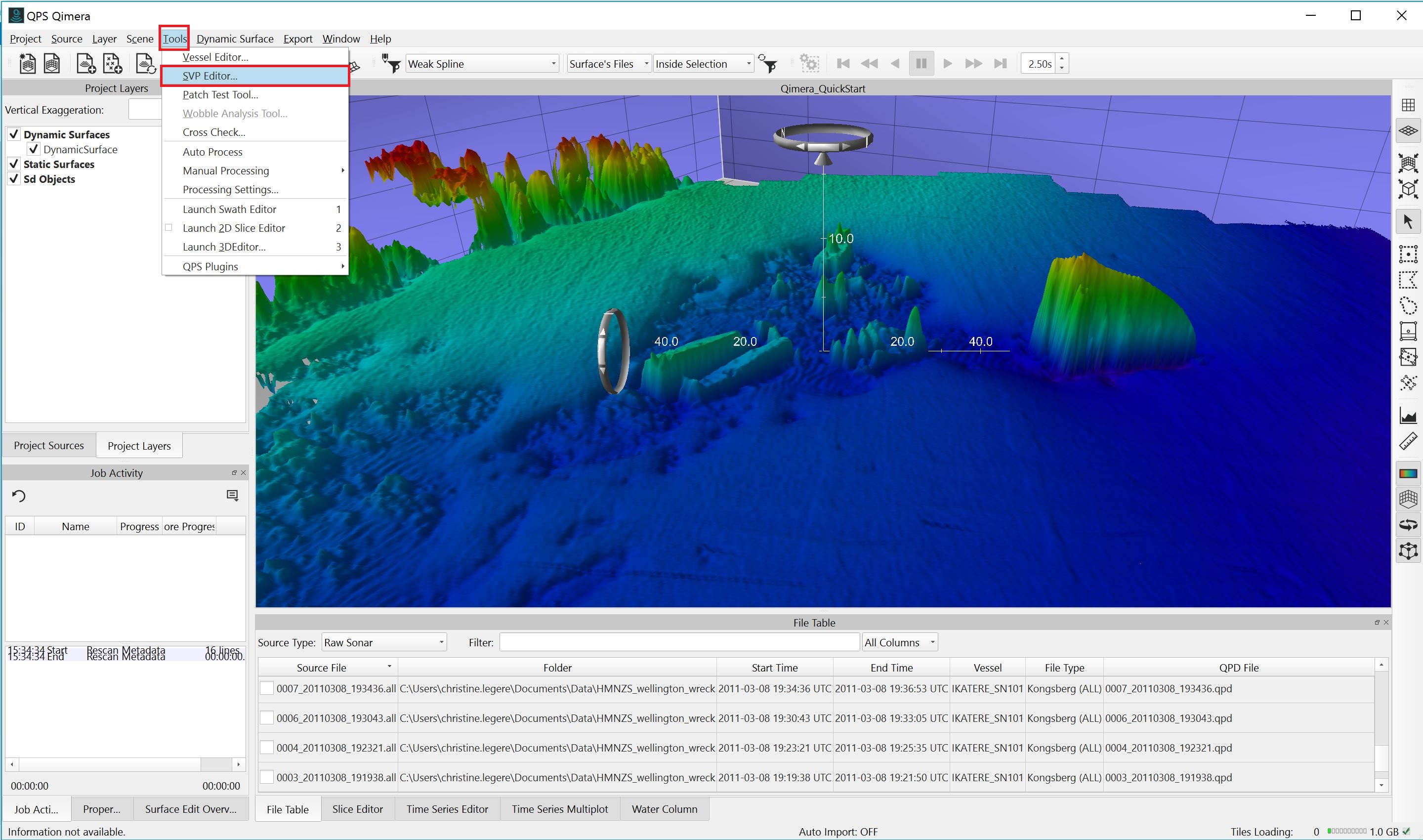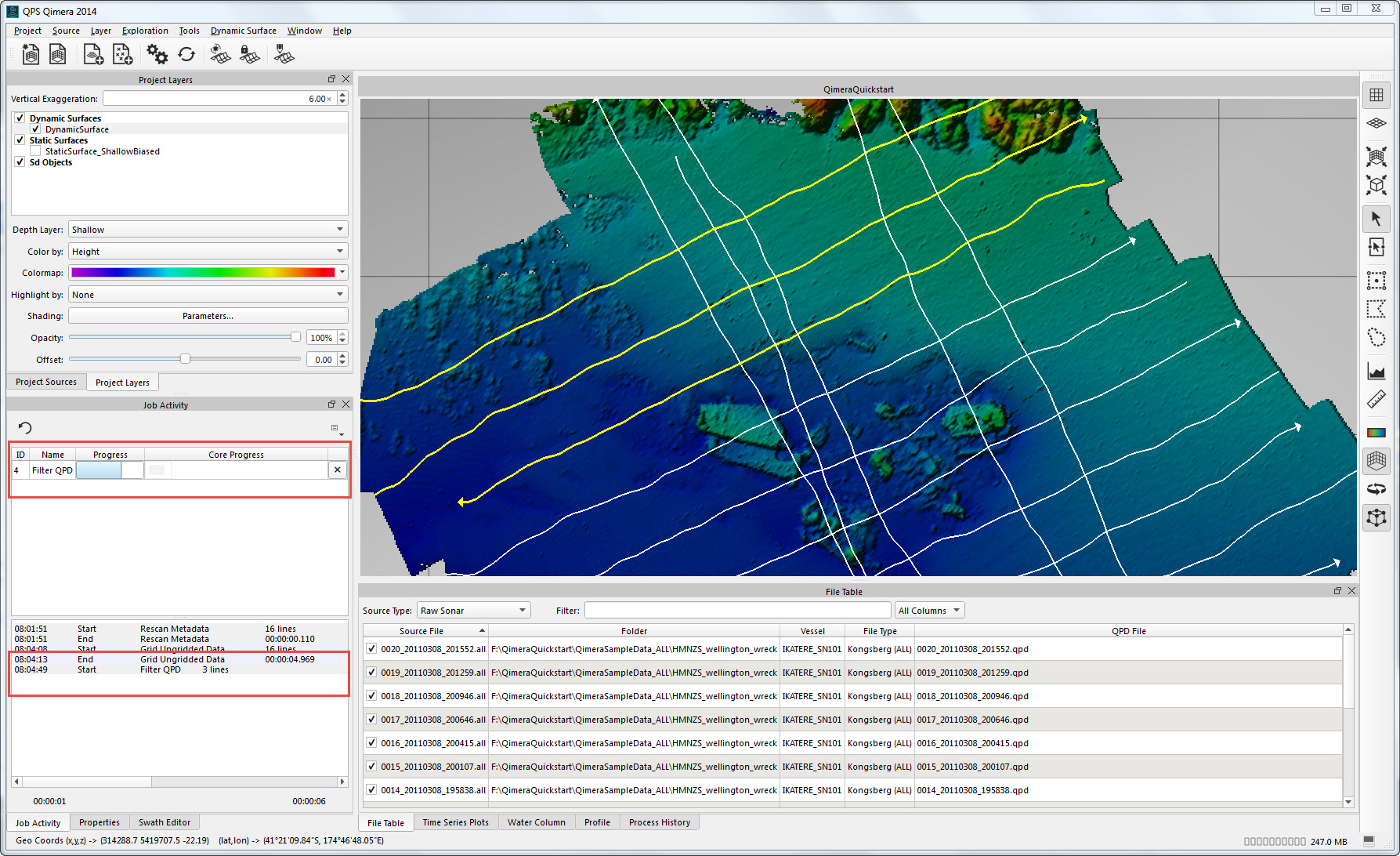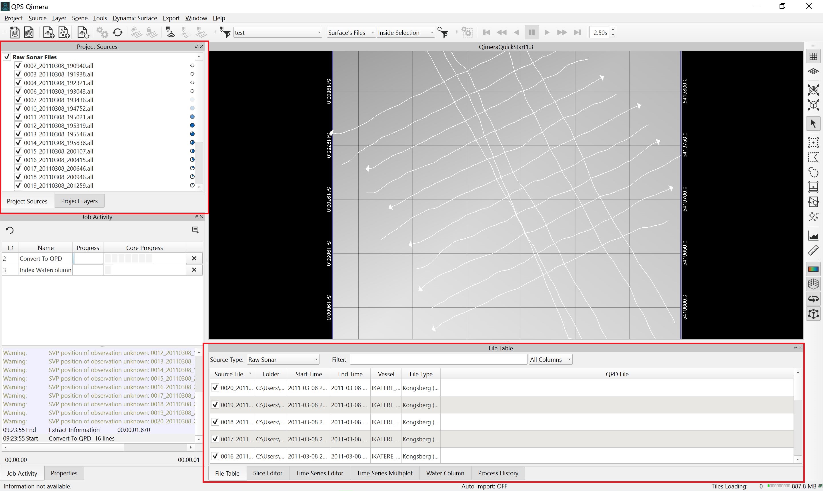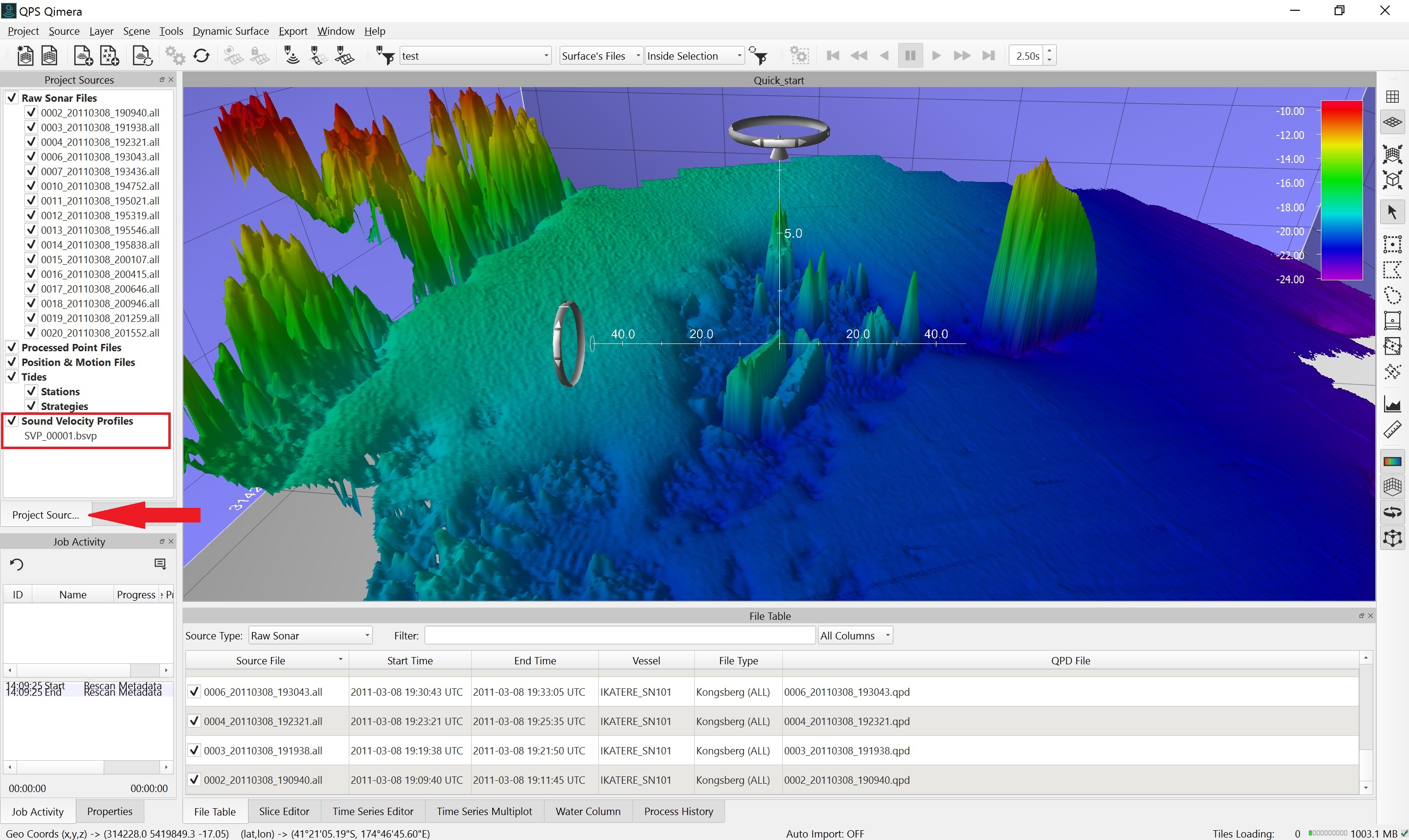 Getting up and running with Qimera begins with creating a Project, or opening an existing Qinsy project. Qimera projects store bathymetry data in QPD format and external source data such as SVP, vessel and tide; they also allow you to manage your data processing flow and preserve any processing steps that you have already accomplished, and provide a centralized location for storing exported products. The data used for this Quickstart is Kongsberg EM2040 single head data from Wellington, New Zealand and was part of the Shallow Survey 2012 common dataset; Download files. These files are Raw Sonar Files and when using Qimera they can be fully processed.