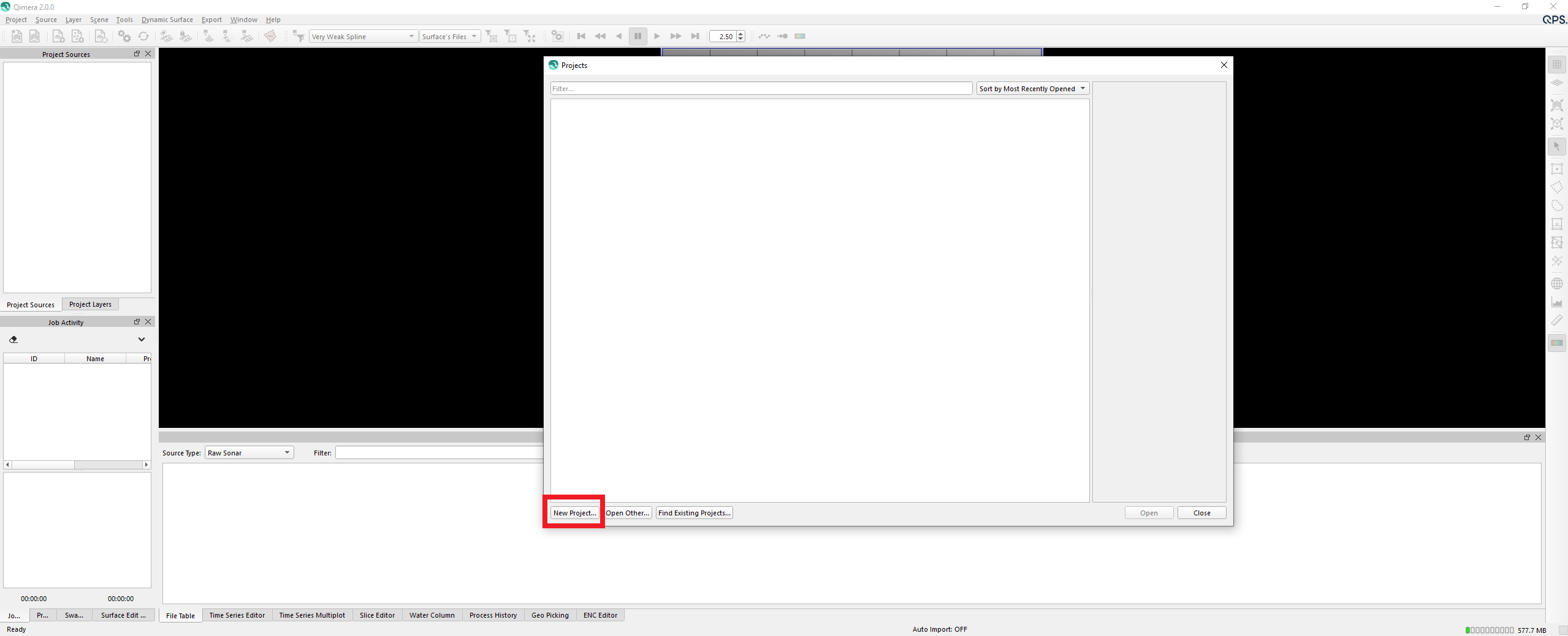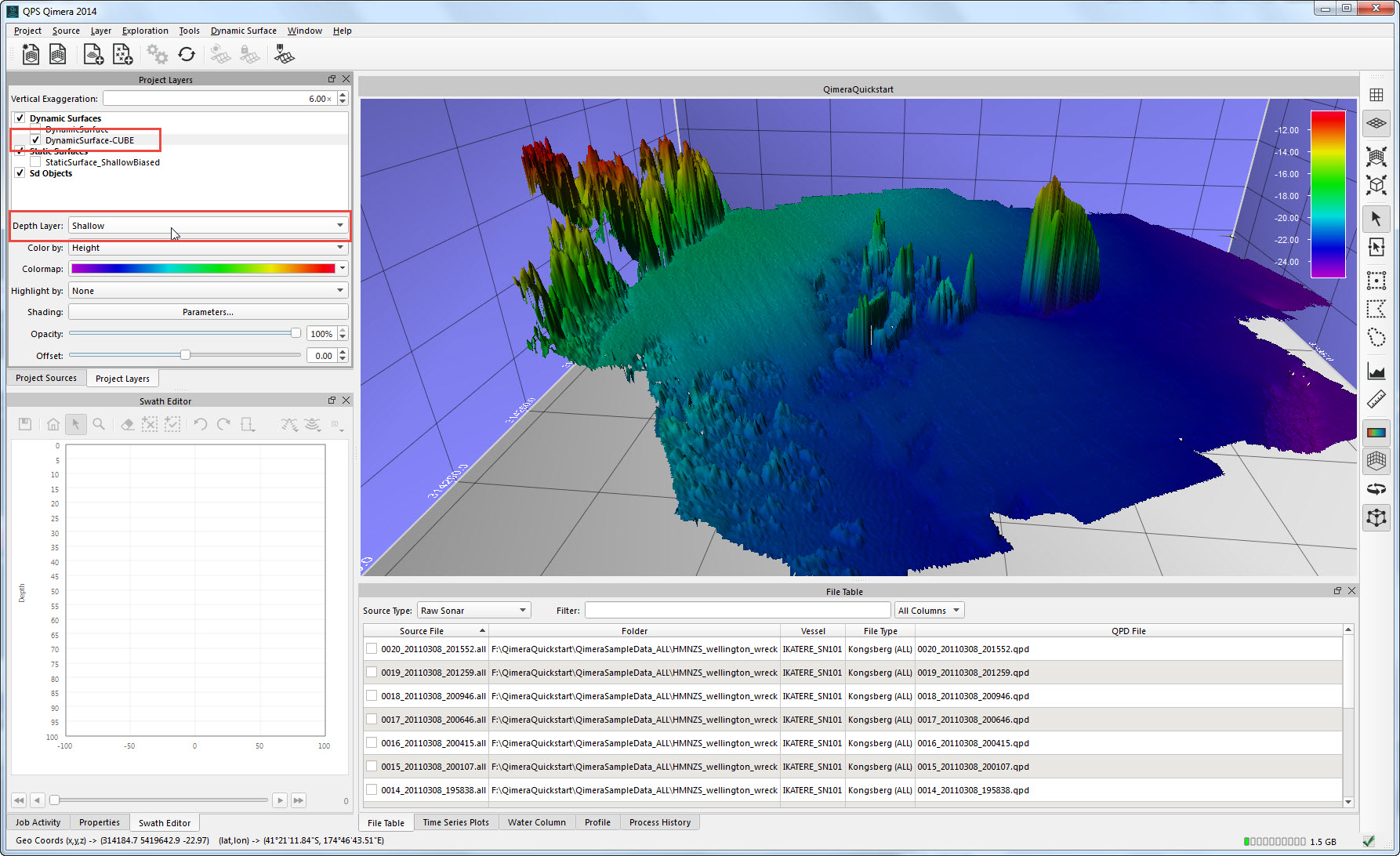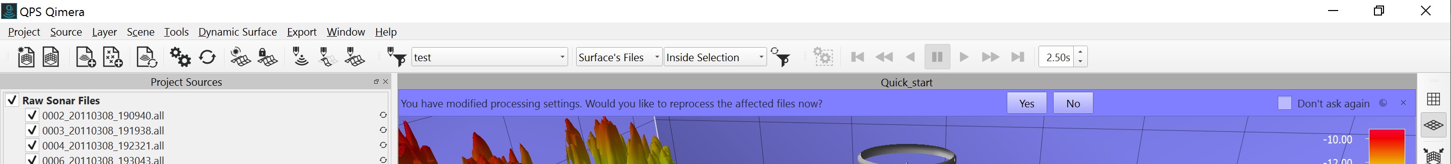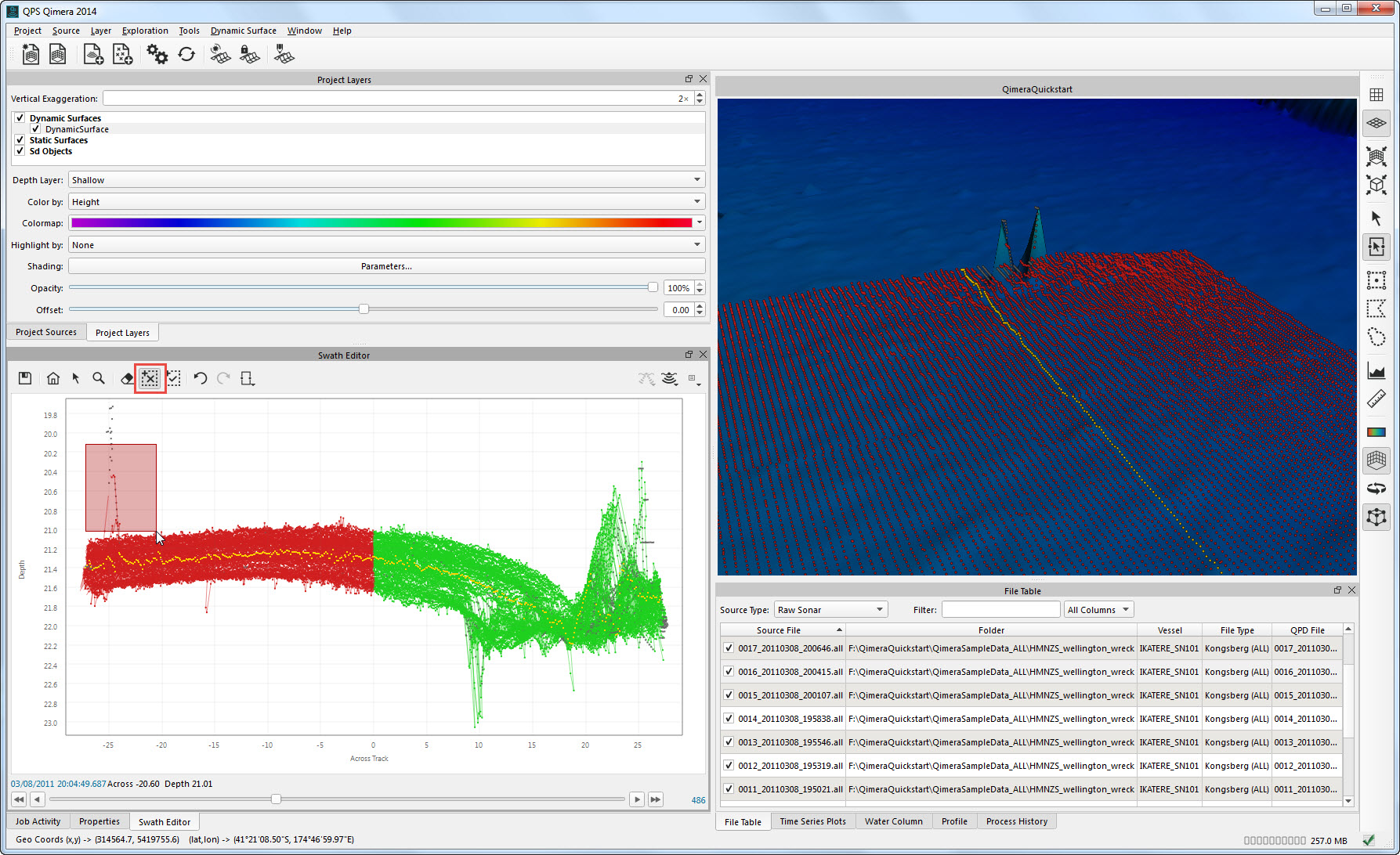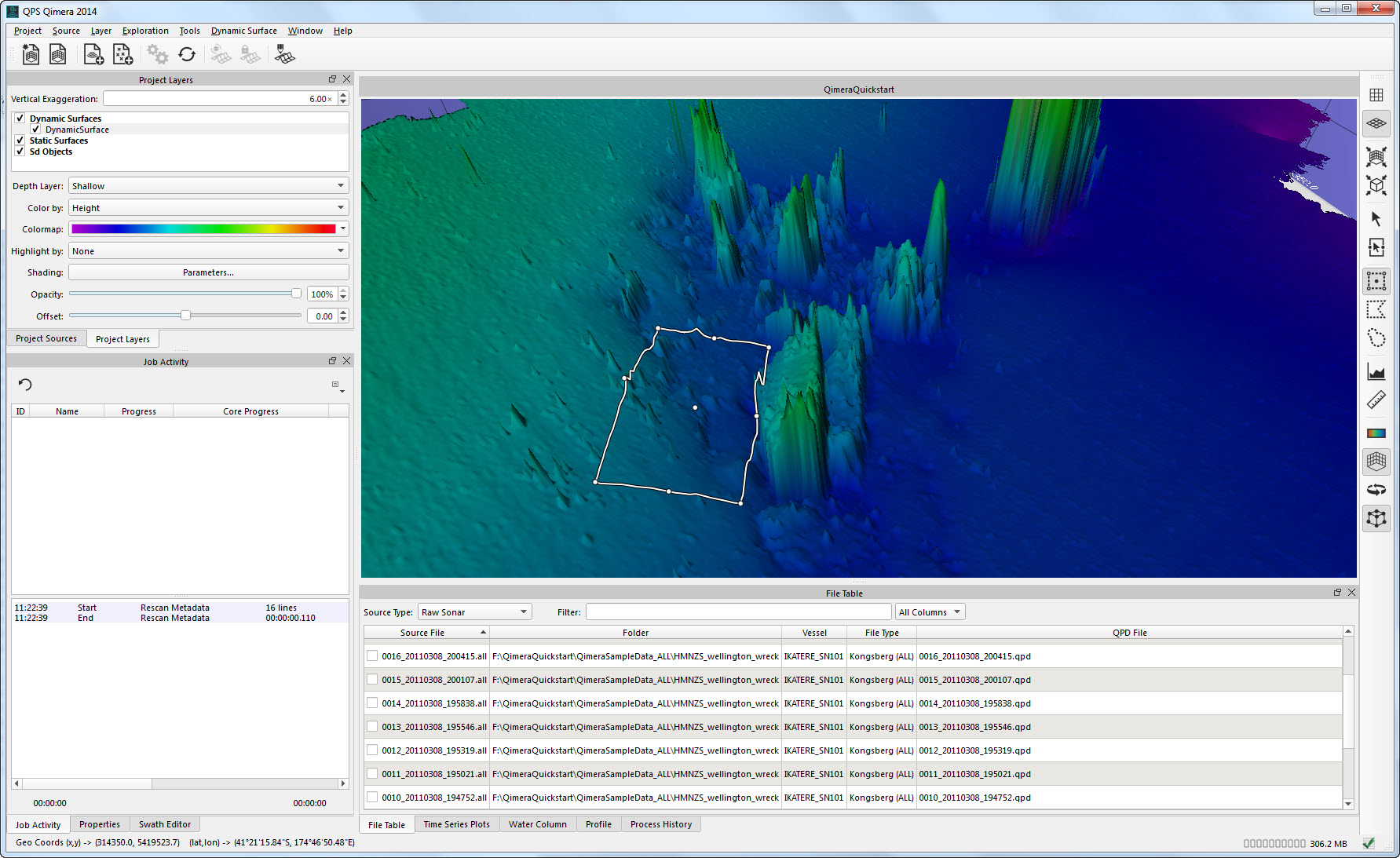 Getting up and running with Qimera begins with creating a Project, or opening an existing Qinsy project. Qimera projects store bathymetry data in QPD format and external source data such as SVP, vessel and tide; they also allow you to manage your data processing flow and preserve any processing steps that you have already accomplished, and provide a centralized location for storing exported products. The data used for this Quickstart is Kongsberg EM2040 single head data from Wellington, New Zealand and was part of the Shallow Survey 2012 common dataset; Download files. These files are Raw Sonar Files and when using Qimera they can be fully processed.