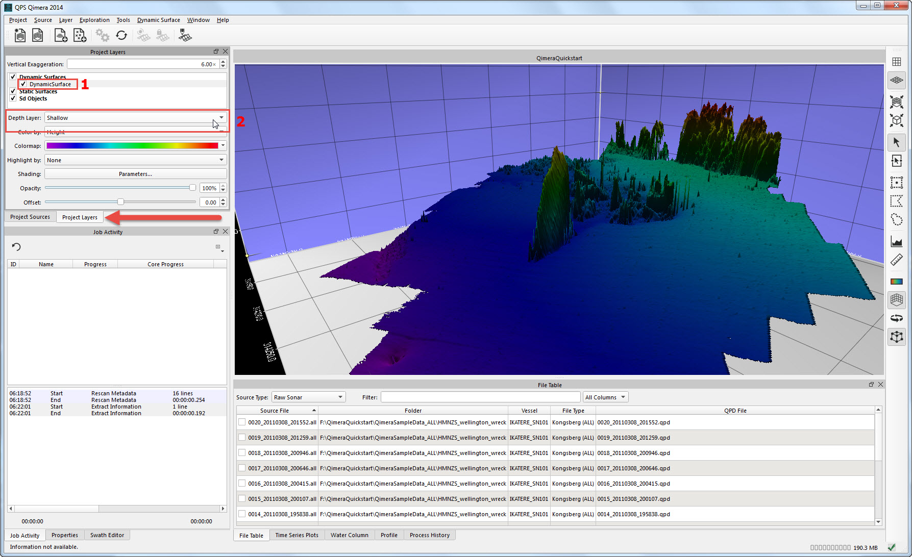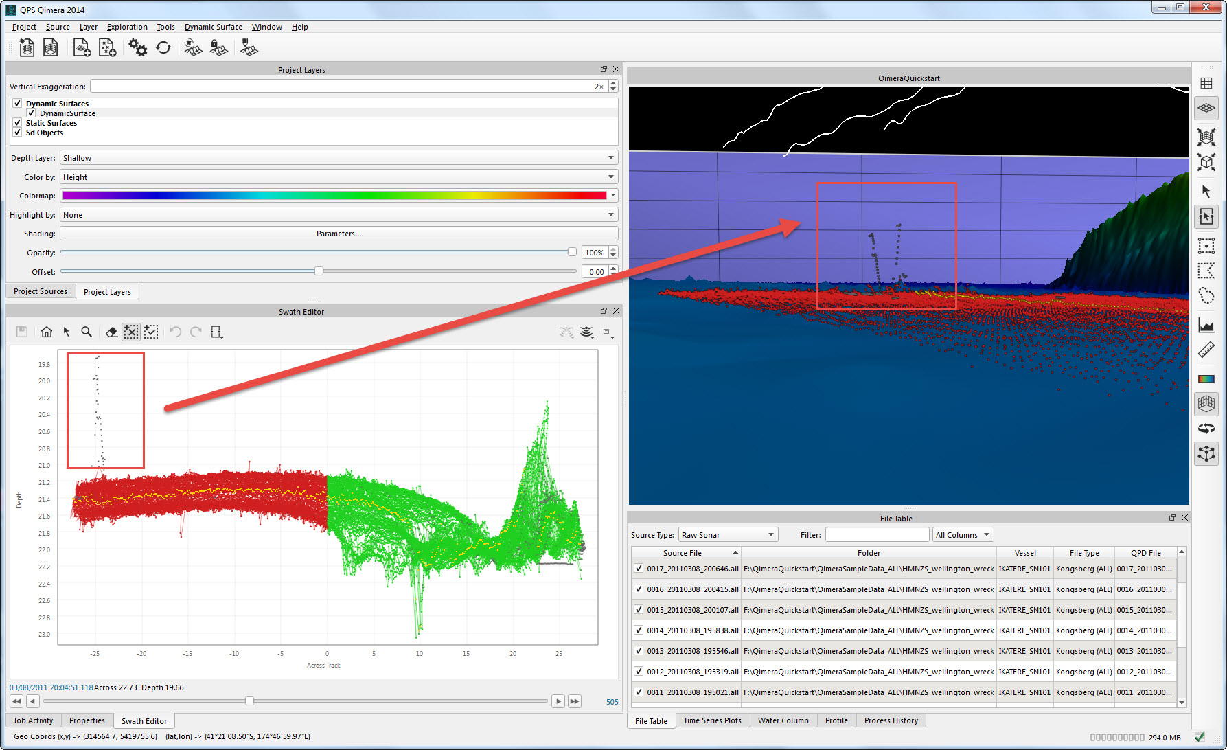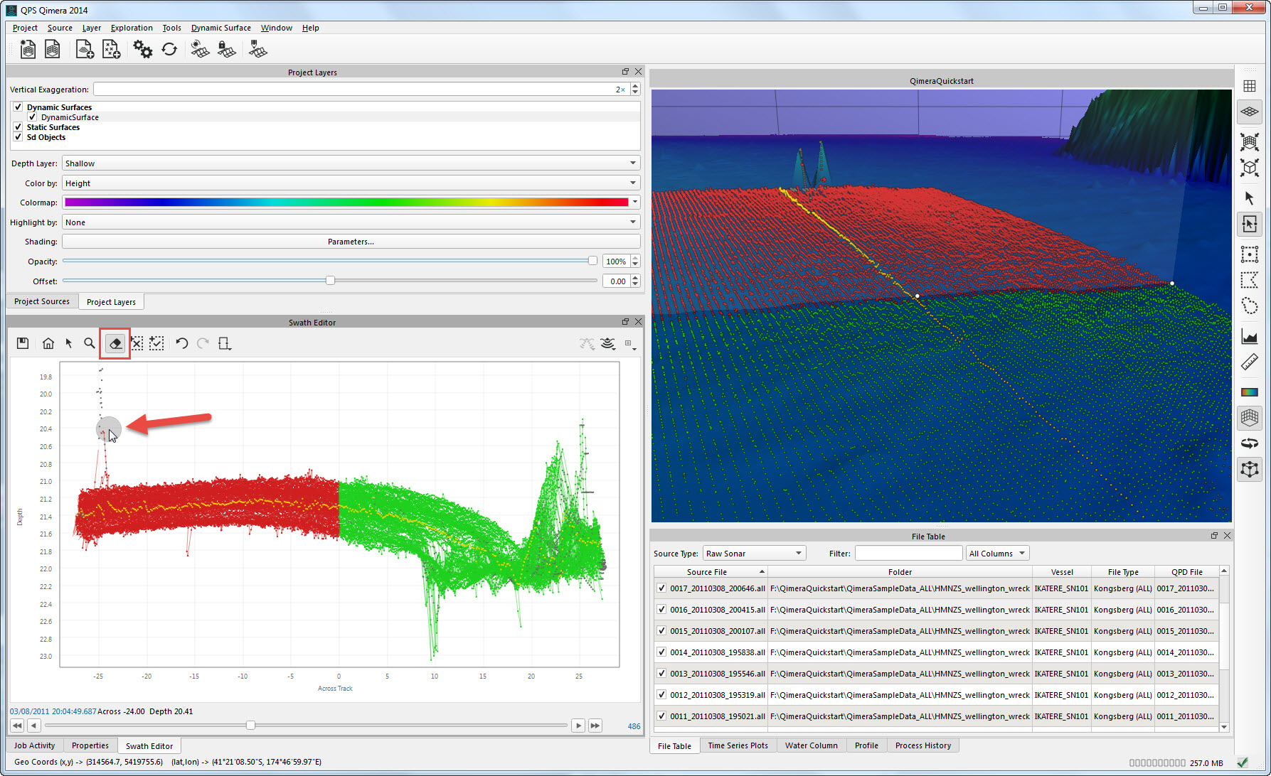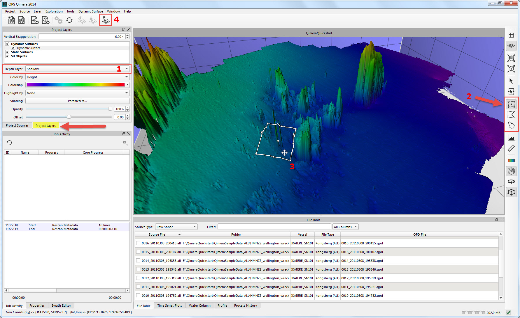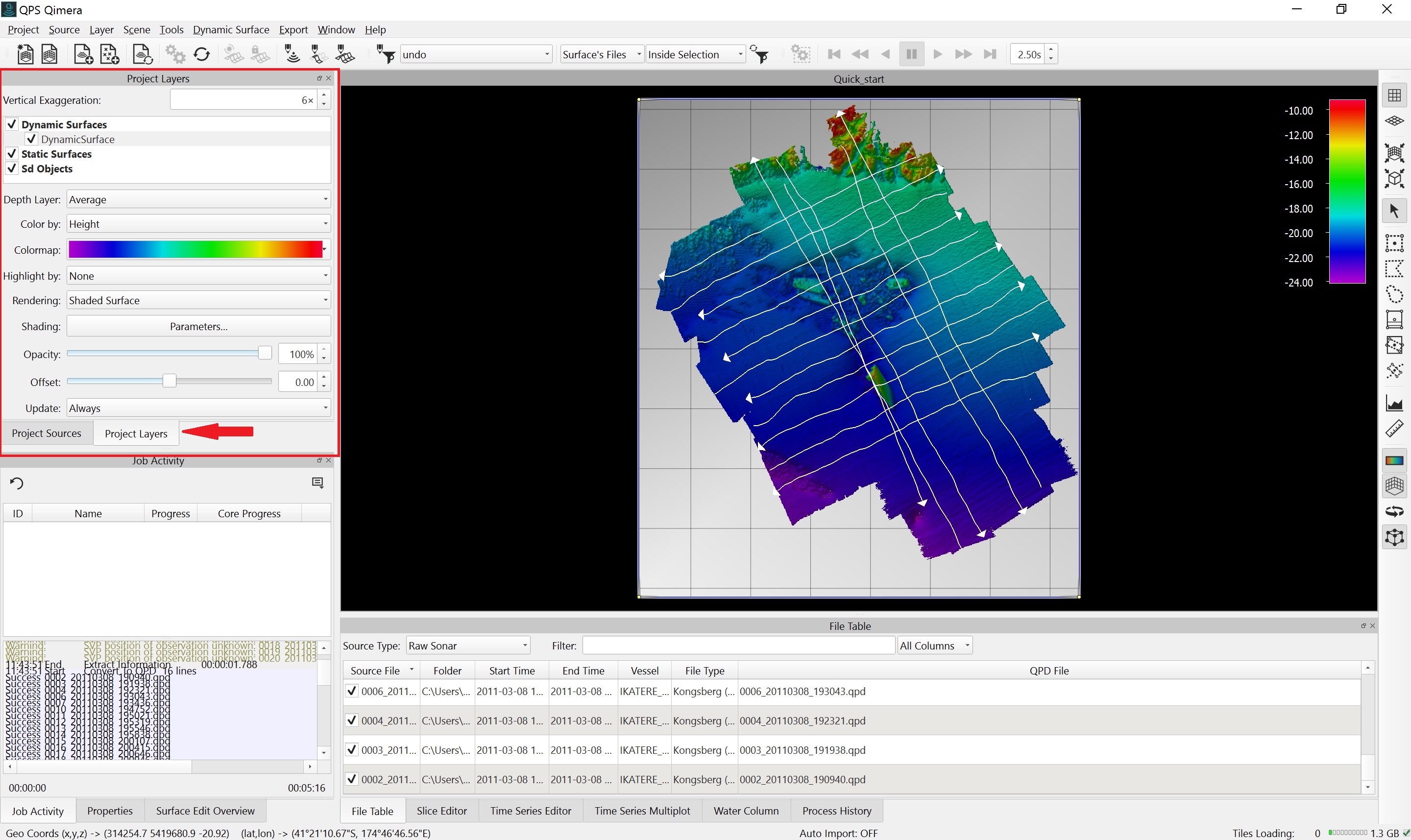 Getting up and running with Qimera begins with creating a Project, or opening an existing Qinsy project. Qimera projects store bathymetry data in QPD format and external source data such as SVP, vessel and tide; they also allow you to manage your data processing flow and preserve any processing steps that you have already accomplished, and provide a centralized location for storing exported products. The data used for this Quickstart is Kongsberg EM2040 single head data from Wellington, New Zealand and was part of the Shallow Survey 2012 common dataset; Download files. These files are Raw Sonar Files and when using Qimera they can be fully processed.