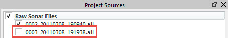 The source files for the project will be listed in the Project Sources Window, under the Raw Sonar Files (which is the Parent level) navigation track lines will also be visible. The check boxes next to each line control visibility in 4D Scene; lines that are checked are visible. Source file location and the QPD file that corresponds to each source file can be viewed in the File Table Window.