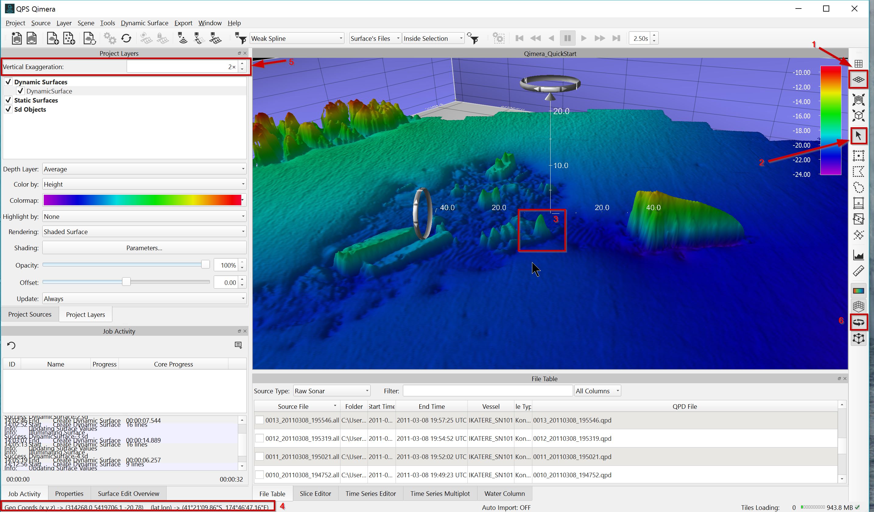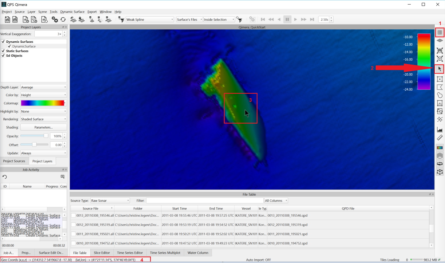(1) will put you into a 4D working environment, making any artefacts in your data simple to spot. To navigate in Turntable View, move your mouse to the 4D Scene. Using Simple Select Mode (2), click and hold your left mouse button then drag your mouse left and right. This will start your grid rotating around the central vertical axis. Click and hold your left mouse button again, and drag your mouse up and down. This will start your grid rotating around the central horizontal axis. Place your mouse on a location of interest, then push down on the scroll button. This moves the location of interest to the center of the screen and is referred to as middle clicking. Use the Scroll button to zoom in and out. Right-click and drag your mouse across the grid. This generates a profile. While moving your cursor along the data (3), note the updating position on the left side of the Status Bar display at the bottom of the screen (4).