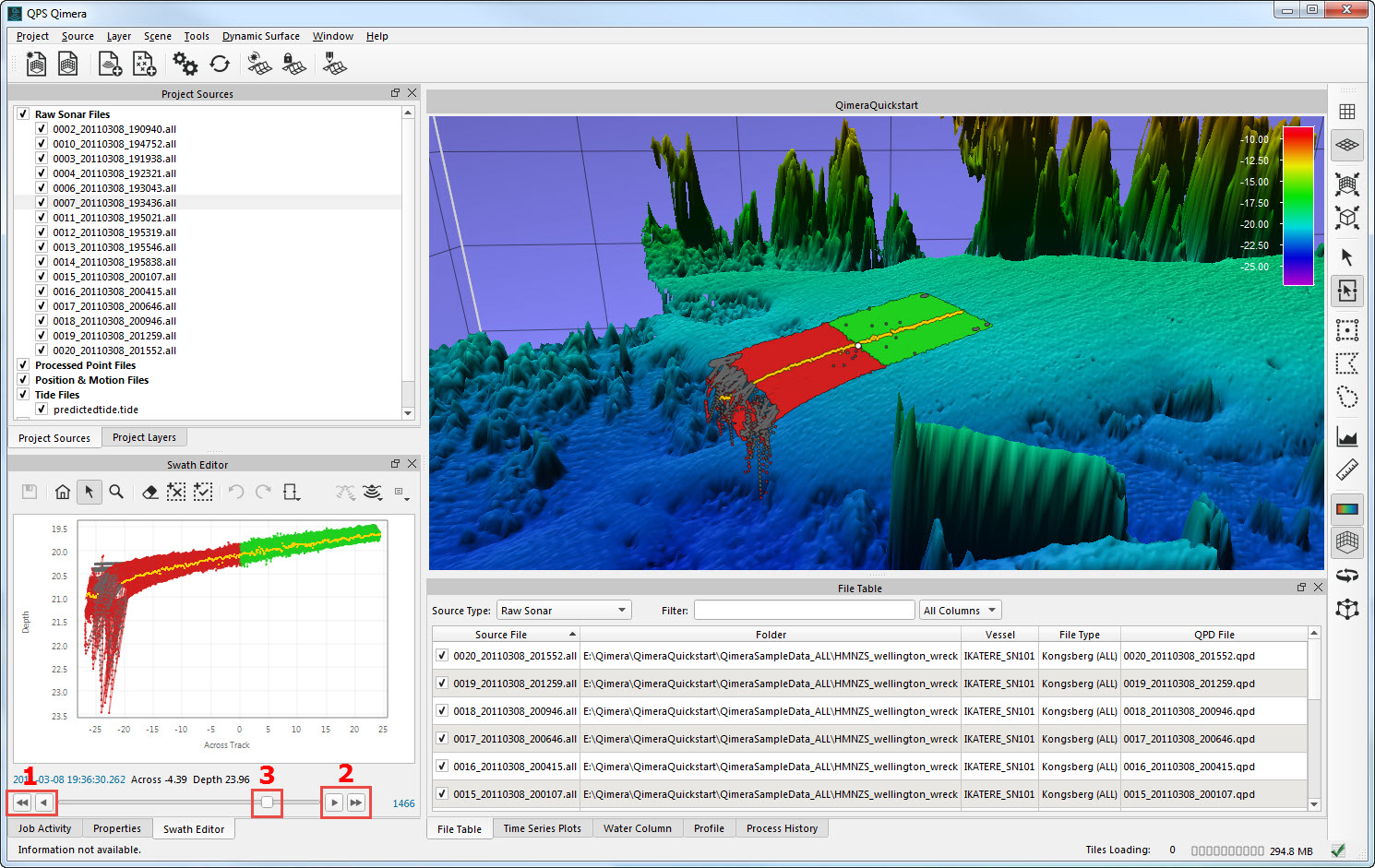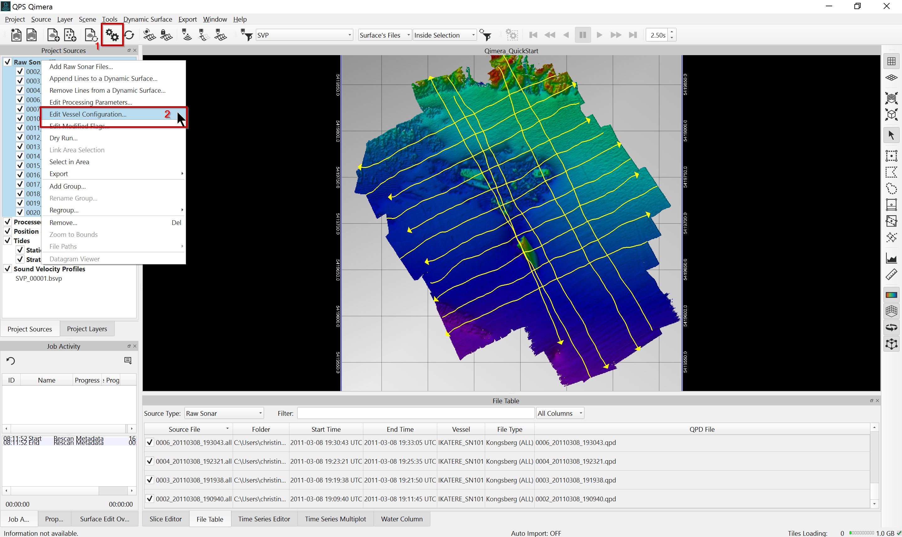 To do Swath-Based Manual Point Editing, select a line for editing either by selecting on the file in the Project Sources Raw Sonar Files tree view (1) or by clicking on one of the tracklines visible in the 4D Scene (the tracklines will need to be checked on in the Project Sources Window). Then, activate the Swath Editor in the Toolbar or press the '1' key. This will load the number of pings defined by the Buffer Width