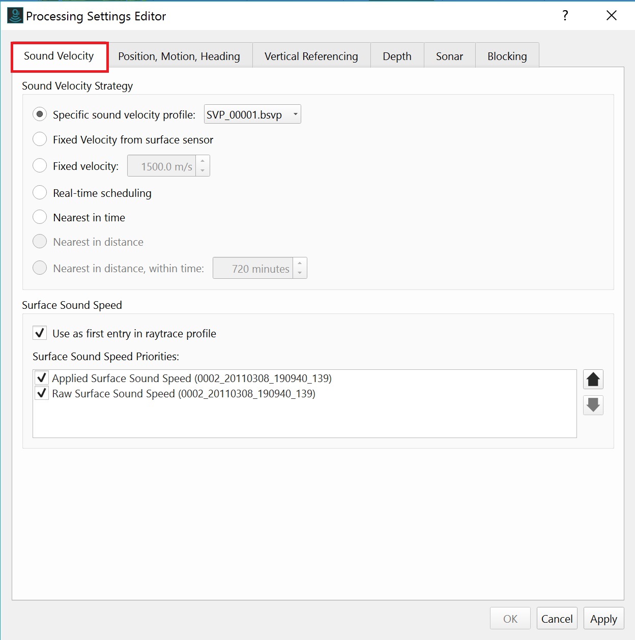 SVP information that is part of the source data will be used for processing and creation of the Dynamic grid from the beginning. Otherwise, the addition of new or additional SVP information will require manual intervention to link the newly imported SVP files to be applied to particular raw source files. This is done by editing the Sound Velocity Strategy in the Processing Settings Editor for all raw multibeam source items that require updating (accessing the Processing Settings Editor is described below).