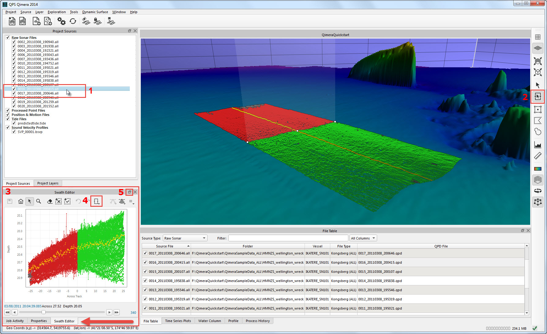 Overview of the Qimera interface when using Swath Editing. Box 1 shows the line selected for editing. Box 2 indicates the Swath Select Mode. Box 3 and the red arrow indicate the position of the Swath Editor Window. Box 4 shows the location of the Buffer Width. Box 5 shows the location of the button used to undock the Swath Editor Window.