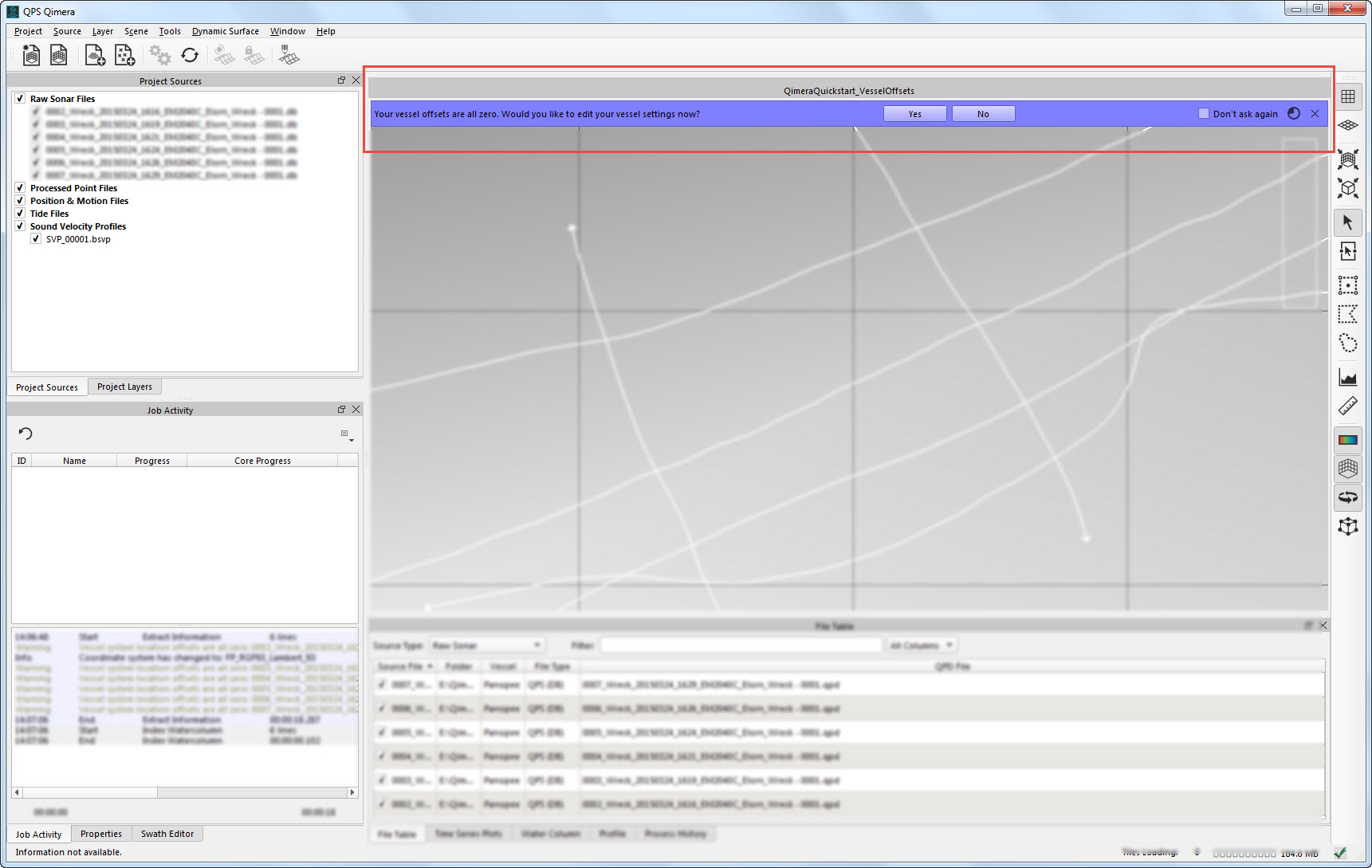 In some cases, the vessel offsets and motion information may not have been populated online. This information can be added in the Vessel Editor. If no vessel offsets or motion information is detected when the source files are added, you will get a warning that the vessel offsets are zero, and Qimera will ask you if you want to edit the vessel information.